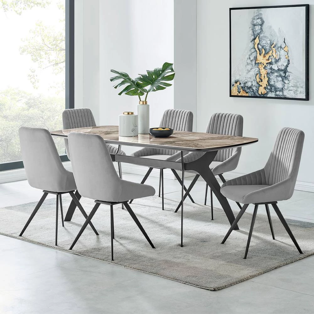 Bring the Andes and Alison 7-Piece Dining Set from Armen Living into your home. The velvet upholstery is luxuriously wrapped around the entire seat. Featuring a wide back and spacious seat, its metal swivel mechanism allows you to turn and glide a full 360°. The clean geometric upholstered lines add a textured look to this chair, covering the ultra-comfortable foam-padded cushion. The refined look of the Alison will update the decor in any dining room, bar or lounge area or wherever you decide to place it. This wonderful chair features a sturdy metal frame that assures dependability and will give you years of enjoyment. The Andes Dining Table adds a touch of pure sophistication to a kitchen, bar or lounge area or even a breakfast nook. It features a strong and striking stainless steel 4-legged base, giving it sleek and stunning visual appeal. The rectangular ceramic top completes the elegant look, while also contributing to the durability of this piece – not only easy to clean but will last years for you and your home. Modern in style, this table is perfect for relaxing with a glass of wine after work or enjoying entertaining a large group of guests.
