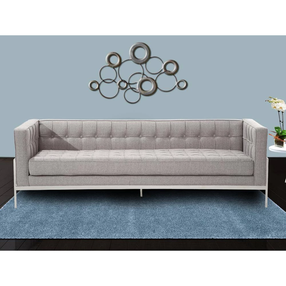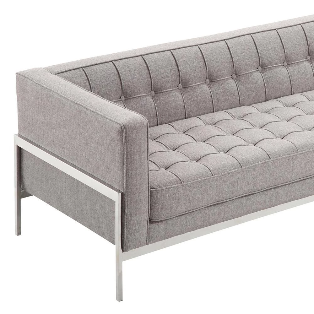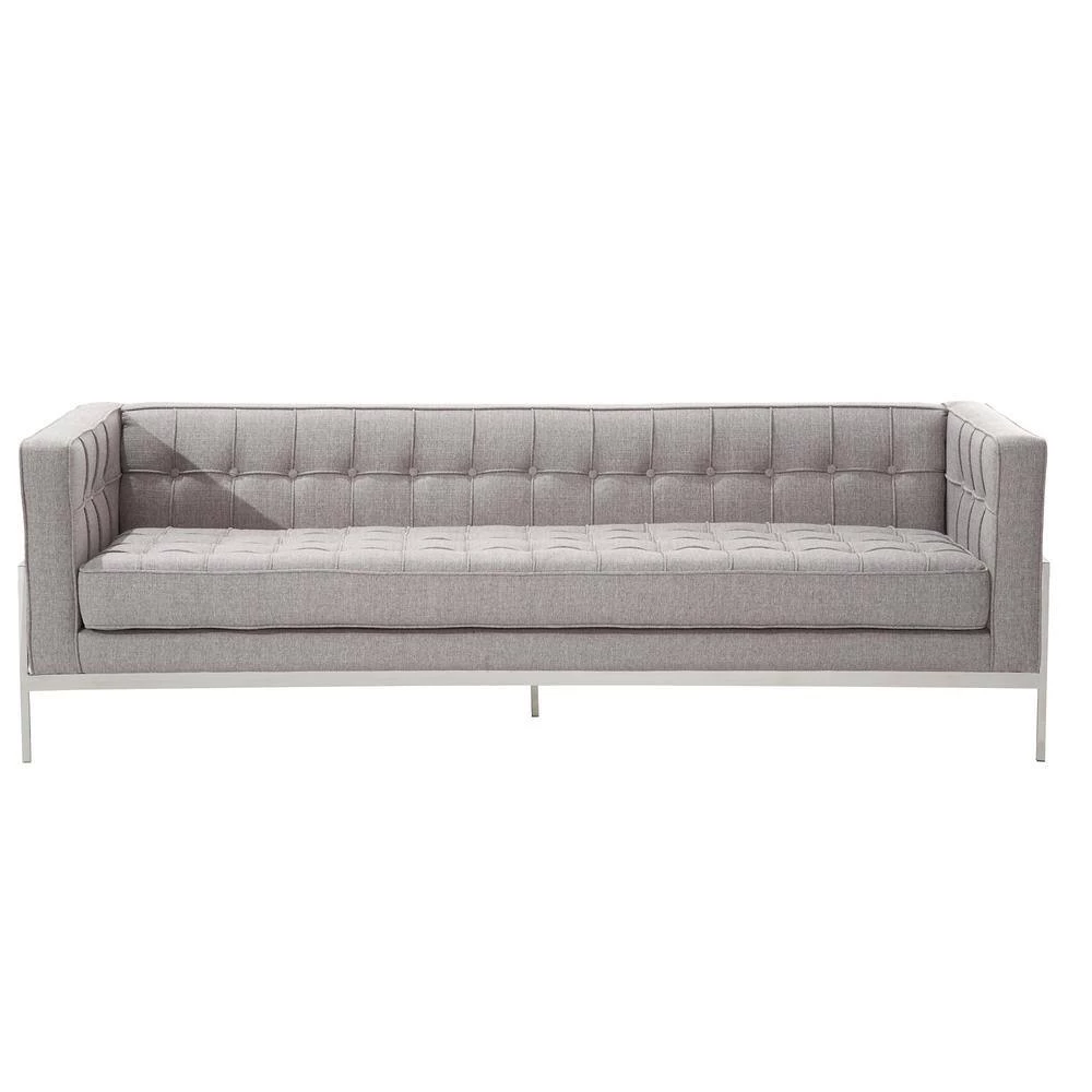 The Armen Living andre mid-century sofa is a stunning example of contemporary beauty sure to make a statement in any modern living room or lounge area. The andre’s stainless steel metal frame is both stylish and sturdy. The sofa’s tweed upholstery is beautifully button tufted and plush, presenting an inviting aesthetic and an exceptional level of comfort. Pair the andre sofa with the andre side chair and loveseat for added cohesion and harmony. Available in gray.