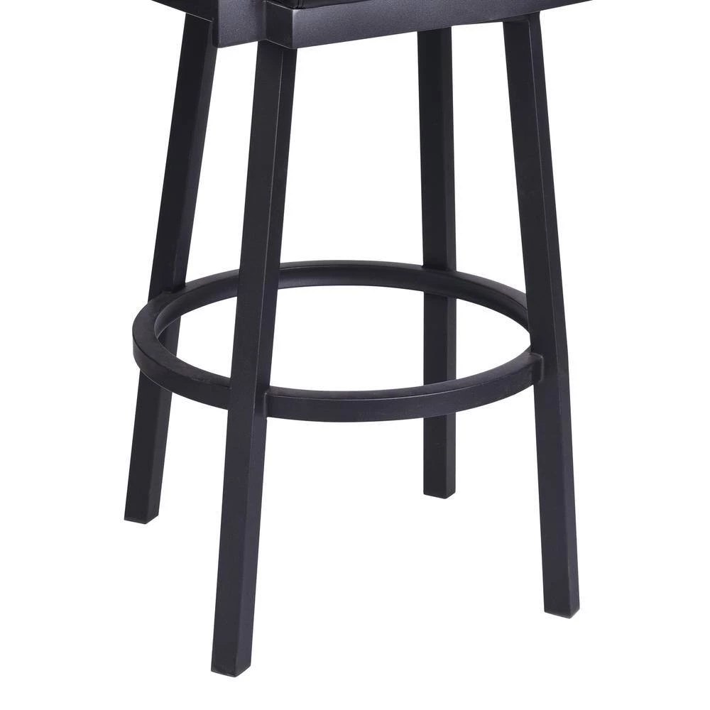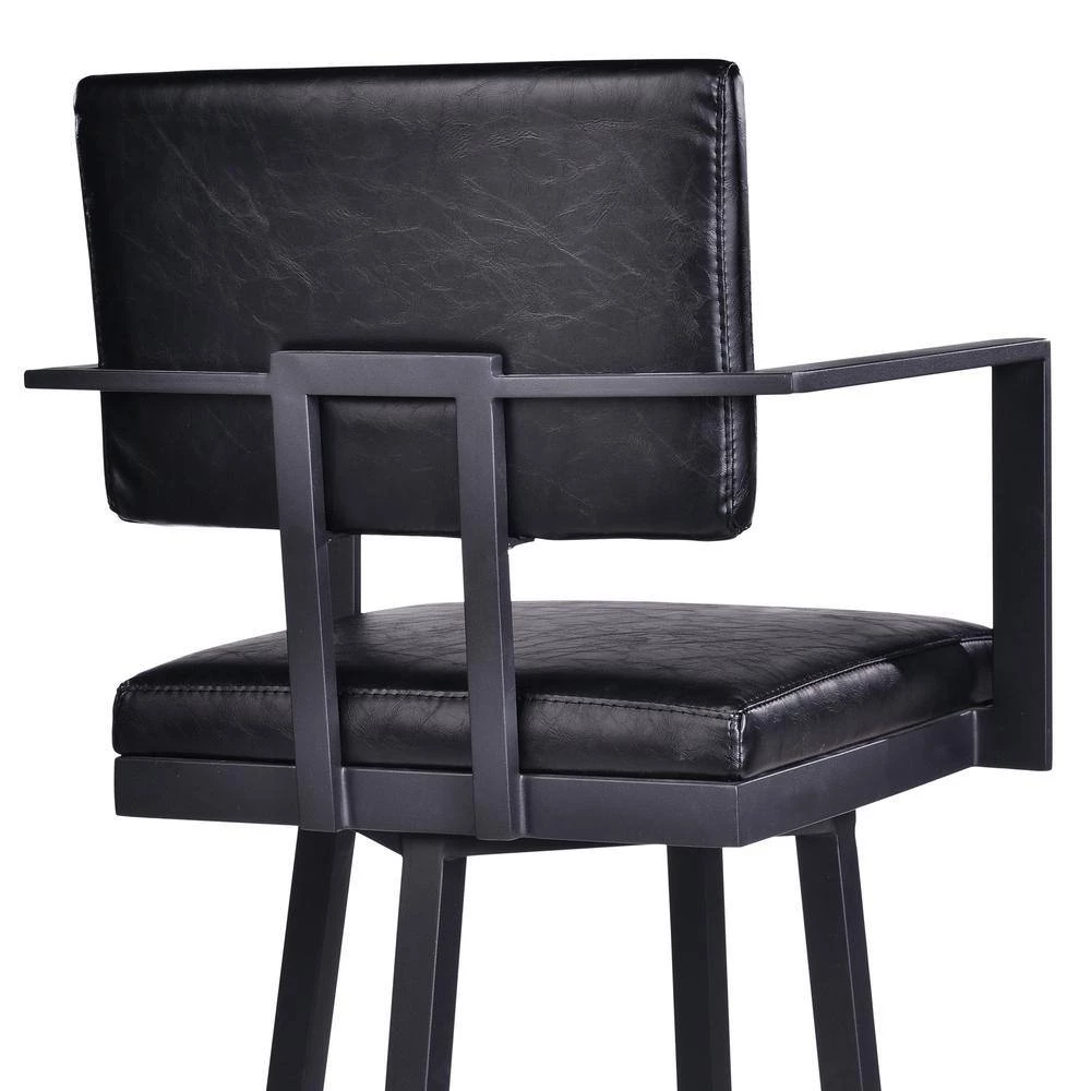 The Armen Living Balboa contemporary barstool is a terrific choice for any modern household. Featuring a sturdy black powder coated finish metal frame and elegant Vintage Black faux leather upholstery, the Balboa is a dependable product that does not cut corners on style. The Balboa upholstered low back is accompanied by the inclusion of convenient arms, for added user support and comfort. The barstools plump foam padded seat features a 360 degree swivel mechanism, allowing for enhanced mobility while seated. The Balboa legs include a round footrest and come tipped with floor protectors, making sure that the barstool will not damage hardwood or tile floors when moved. The armed balboa barstool is sold in two industry standard sizes; 26 inch counter and 30 inch bar Height.
