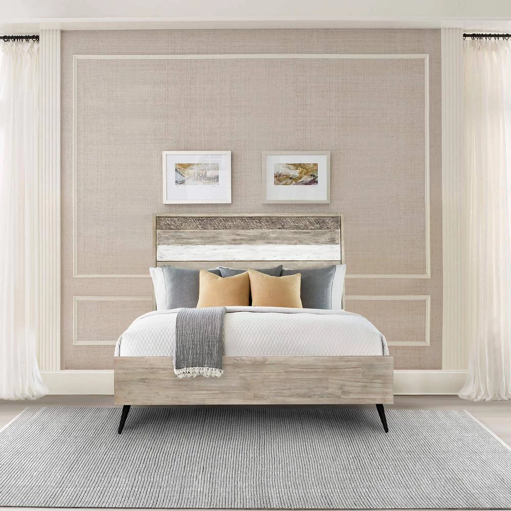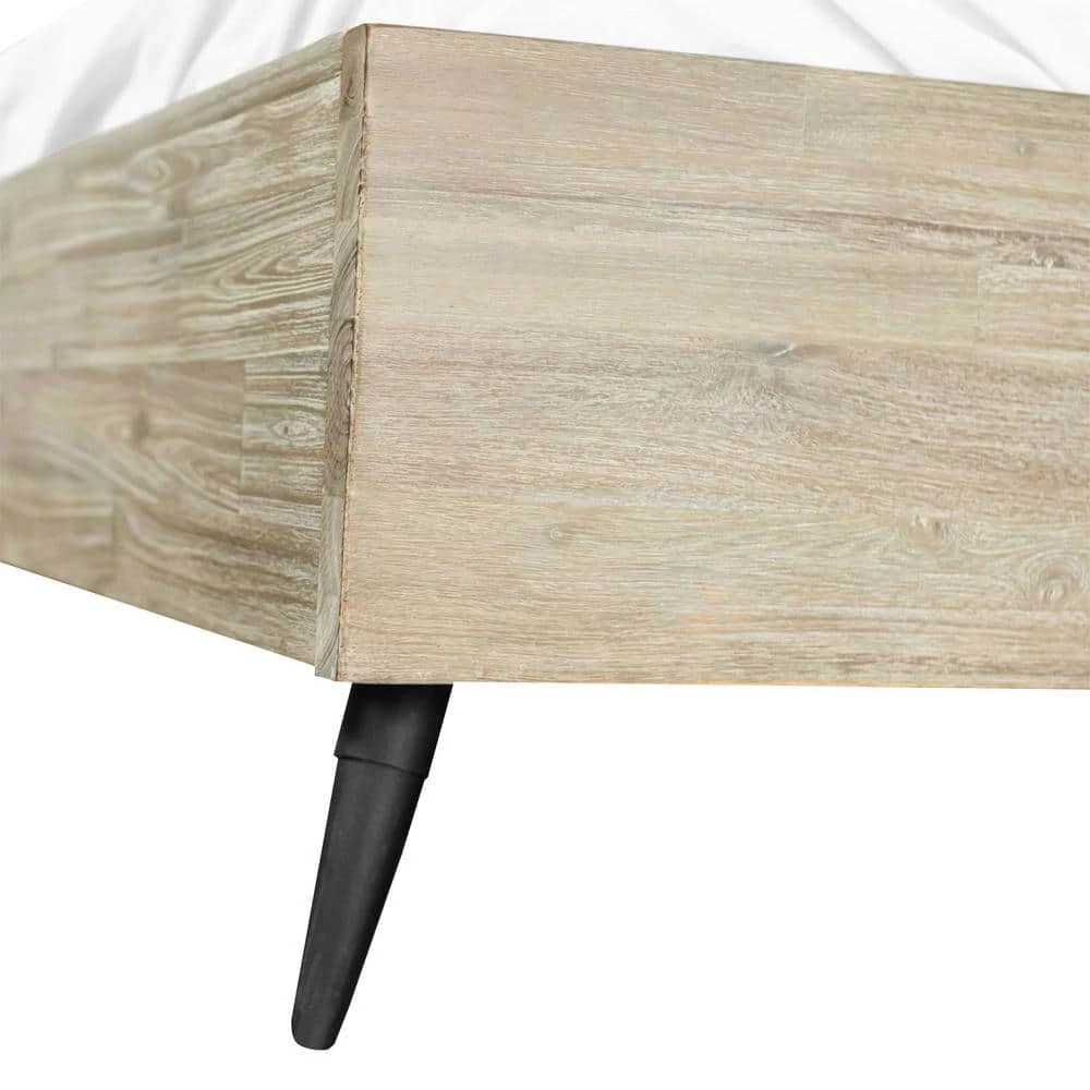 Invite the grace of natural textures into your home with the Bridges platform bed frame in two-tone Acacia wood. Crafted from solid Acacia, the bed frame displays one-of-a-kind markings and rich wood grains to enliven your bedroom. providing a modern yet rustic aesthetic. Its tall headboard exuberantly displays a variety of textures and tones to maintain a sleek and sophisticated presence. The slim rails of the bed frame are elevated upon black metallic legs to make your bedroom.light, airy, and inviting. Acacia wood is ideal for furniture as it is resistant to wear and tear. It is the hardest of hard woods and is highly water resistant as well. In addition, this platform bed frame offers storage space under it for your convenience. The strength-to-weight ratio of acacia wood is one of the best in the world, making it perfect for furniture that needs to be lightweight but still durable. It is resistant to moisture and pests and does not warp. If you are looking for a long-lasting material for your furniture, then acacia wood is worth considering. The wooden slats ensure your comfortability by allowing air to pass freely beneath your bed, ensuring your mattress maintains its freshness and gives you many more years of enjoyment. The Bridges platform bed is the ideal choice for your bedroom. or guest room.and is available in your choice of a king or queen size. The Bridges collection features a unique multi tonal finish that highlights the natural grain of the Acacia wood.