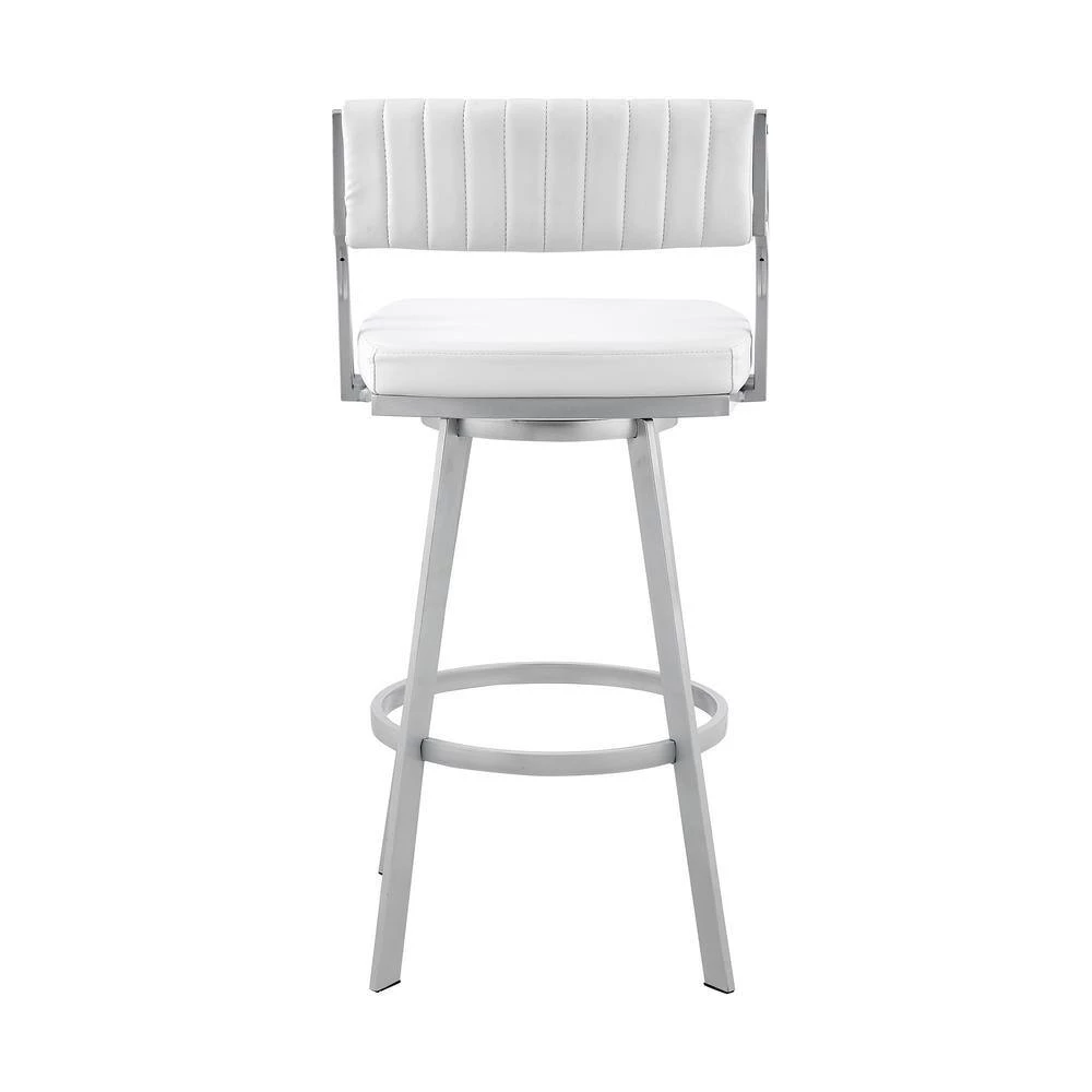 Add a modern furniture piece to your home with the Capri Swivel Modern Metal and Faux Leather Bar and Counter Height Stool. The Capri is a unique design that will be sure to start conversations at all your gatherings. Pull the Capri up to your kitchen island, counter, peninsula, bar, or pub table with ease due to the unique low arm design that allows you to sit as closely to your desired surface as needed. The Capri’s modern style silhouette is perfectly complemented by its channel style stitching on the back piece. The back of the Capri’s open-lower back design allows for cool breathable seating. Enjoy full mobility with the 360-degree swivel function that keeps you fully engaged with guests on all sides of the room. The Capri Swivel Modern Metal and Faux Leather Bar and Counter Height Stool is available in your choice of a Matte Black finish with Slate Grey faux leather, a Brushed Stainless-Steel finish and slate Gray faux leather, or a Silver finish with your choice of White or Slate Grey faux leather upholstery and comes in a Bar 30″ height or a Counter 26″ height and can support up to 250lbs per stool.