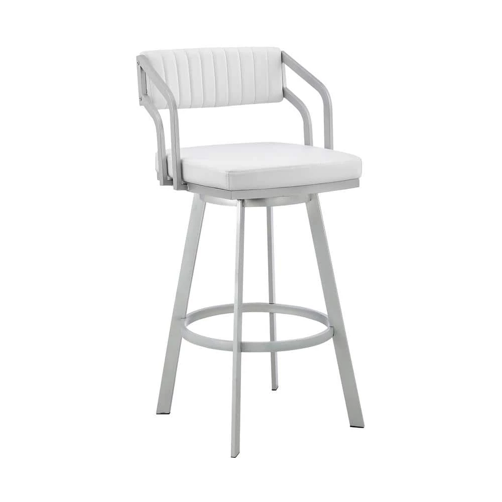 Add a modern furniture piece to your home with the Capri Swivel Modern Metal and Faux Leather Bar and Counter Height Stool. The Capri is a unique design that will be sure to start conversations at all your gatherings. Pull the Capri up to your kitchen island, counter, peninsula, bar, or pub table with ease due to the unique low arm design that allows you to sit as closely to your desired surface as needed. The Capri’s modern style silhouette is perfectly complemented by its channel style stitching on the back piece. The back of the Capri’s open-lower back design allows for cool breathable seating. Enjoy full mobility with the 360-degree swivel function that keeps you fully engaged with guests on all sides of the room. The Capri Swivel Modern Metal and Faux Leather Bar and Counter Height Stool is available in your choice of a Matte Black finish with Slate Grey faux leather, a Brushed Stainless-Steel finish and slate Gray faux leather, or a Silver finish with your choice of White or Slate Grey faux leather upholstery and comes in a Bar 30″ height or a Counter 26″ height and can support up to 250lbs per stool.