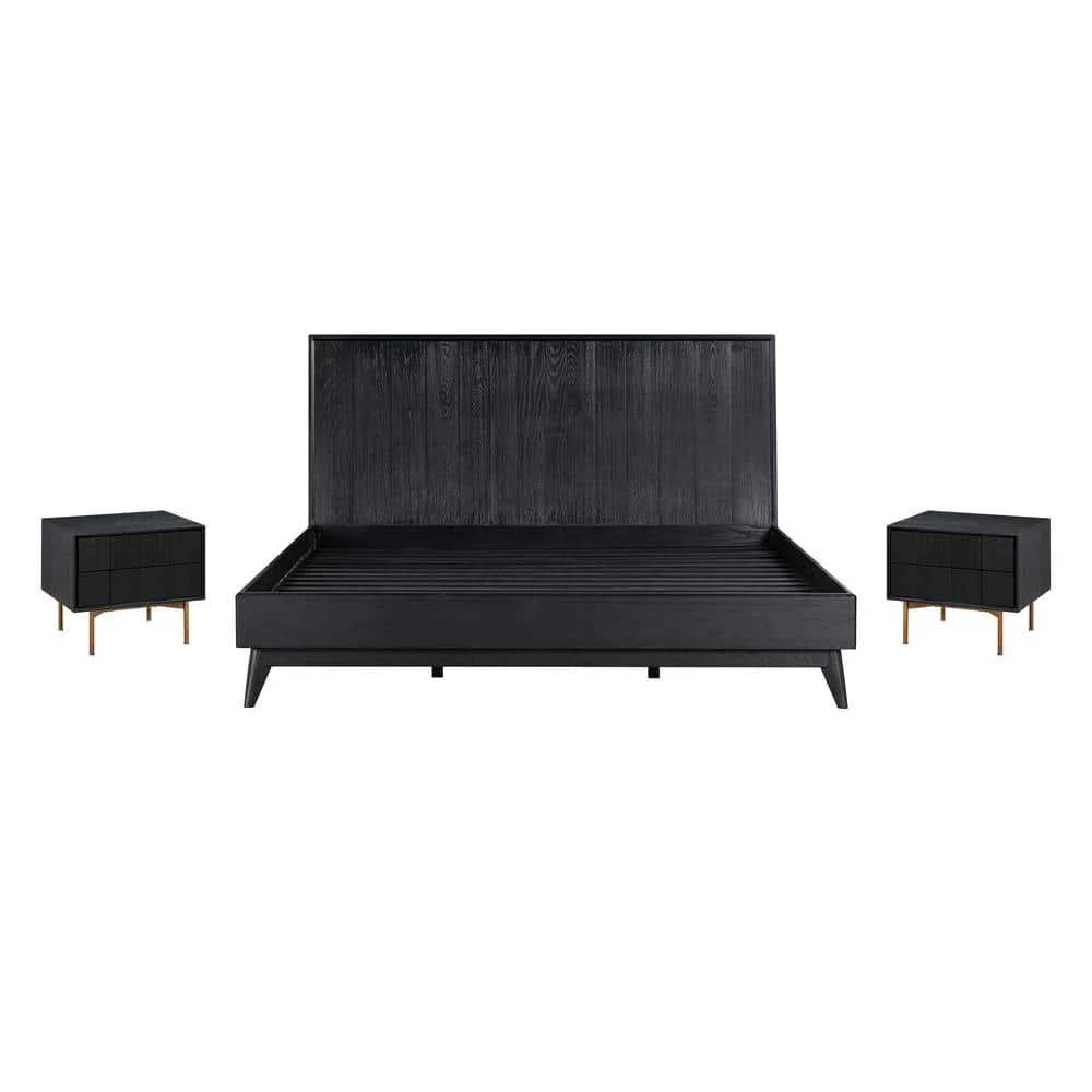 Revamp your bedroom or guest room with the Carnaby 3-Piece Bedroom Set in Black Brushed Oak Wood. Each piece is cut and layered to create an artisanal headboard and drawer fronts that immediately strikes a visual impact Featuring slim and minimal rails elevated upon tapered legs, the bed can truly make your bedroom feel light and airy. The wooden slats ensure your comfortability by allowing air to pass freely beneath your bed frame, ensuring your mattress maintains its freshness and gives you many more years of enjoyment, this also means you can use this bed frame without a box spring foundation. Hybrid, latex, and memory foam mattresses are ideal for use with platform beds, they are known to offer the most support and comfort. Charming and sophisticated, the side tables remain elevated on slender metallic legs. These nightstands feature 2-roomy drawers and ample surface space to hold your phone, lamp, books, or remote. The modern black brushed finish on the oak wood creates a modern and chic aesthetic that can blend into the existing decor of your home, apartment, or condo. Buying a bedroom set together helps ease the stressful decisions to buy separate pieces to coordinate, as well as knowing that all the pieces perfectly match. The Carnaby 3- Piece Bedroom set includes 1-platform bedframe in your choice of king or queen size, and 2- nightstands.
