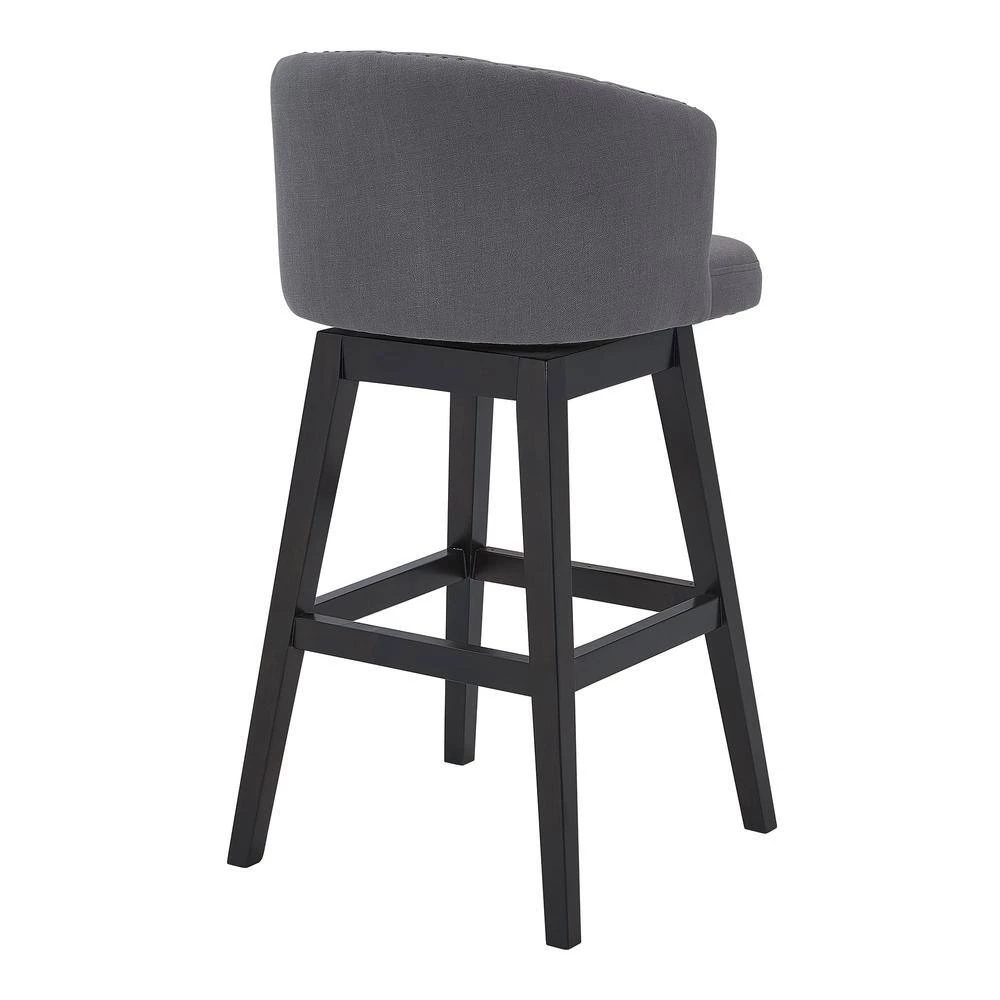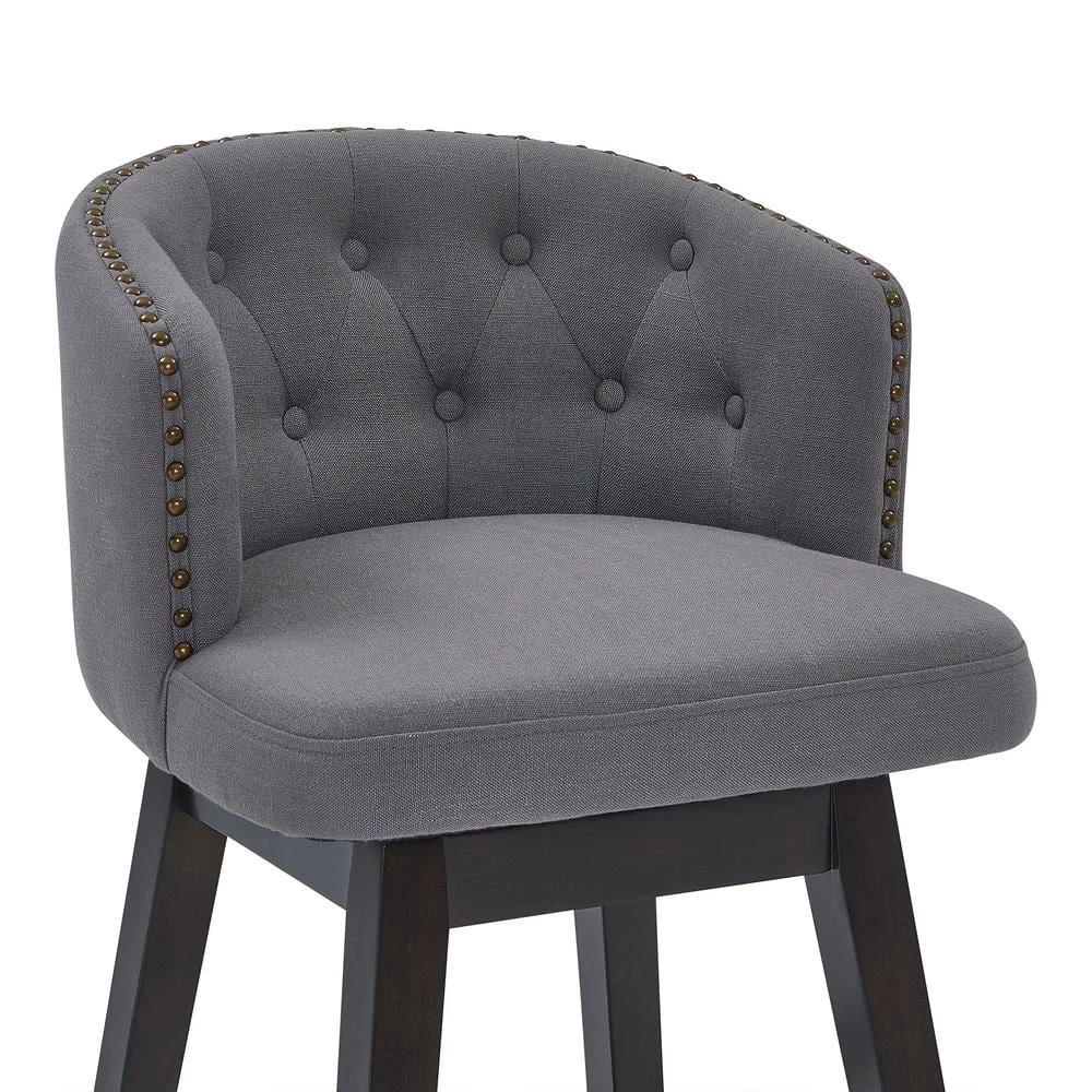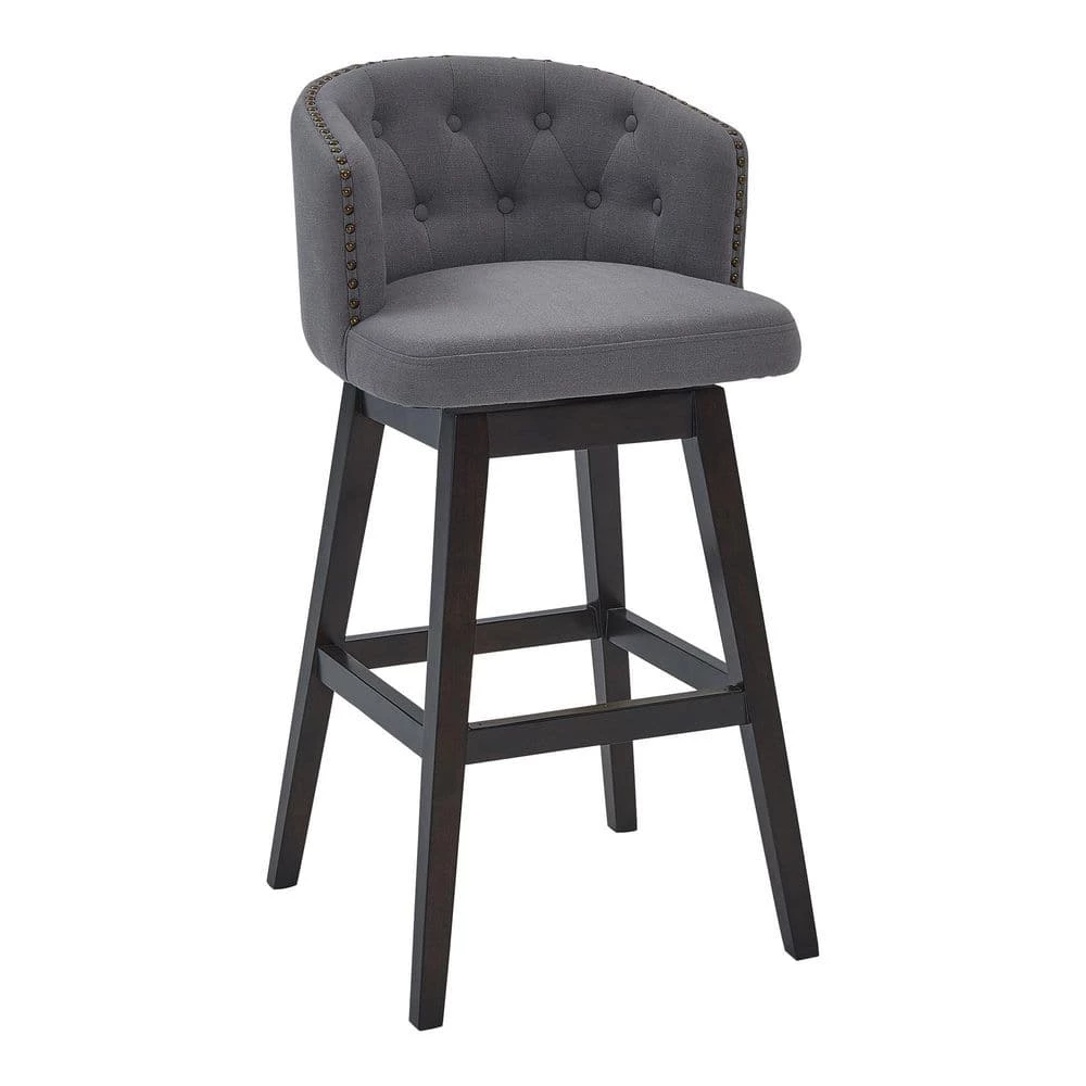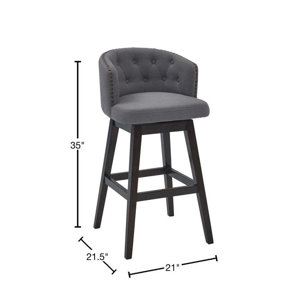The Armen Living Celine wood Bar Stool is an excellent choice for the transitional or contemporary household. Constructed from a combination of eucalyptus and birch wood frame that is certain to maintain its durability for many years to come. The Celines legs feature an Espresso wood finish and the plump, foam padded seat and back of the Bar Stool are upholstered in grey fabric. The back of the Celine is rounded and features tufted accents that add a unique aesthetic accent to the piece. The Bar Stools 360 degree swivel function allows for a wide range of movement while seated and the included footrest provides added comfort and support. The Celines legs are tipped with floor protectors, assuring that the Bar Stool will not damage floors when moved. The Celine is sold in two industry standard sizes; 26 inch counter and 30 inch bar height. This wood Bar Stool is available in gray or tan fabric.