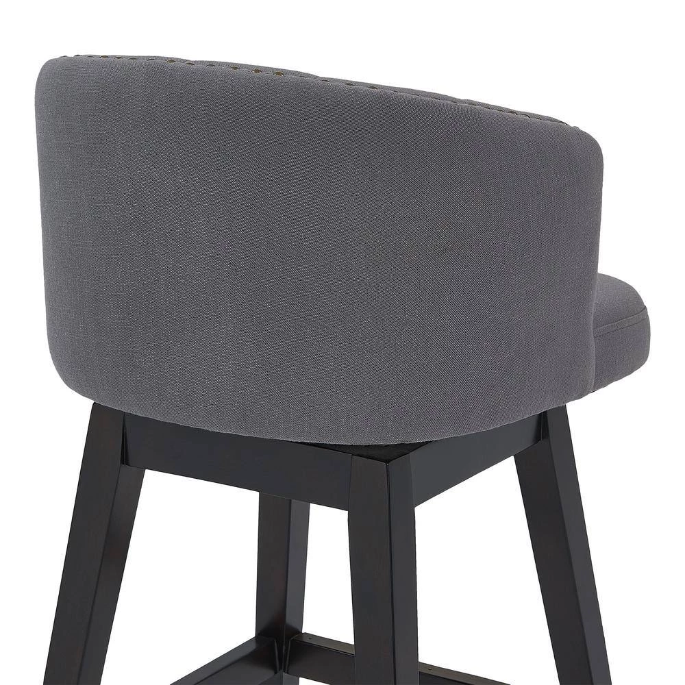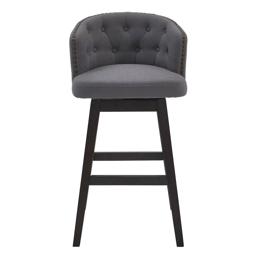 The Armen Living Celine wood Bar Stool is an excellent choice for the transitional or contemporary household. Constructed from a combination of eucalyptus and birch wood frame that is certain to maintain its durability for many years to come. The Celines legs feature an Espresso wood finish and the plump, foam padded seat and back of the Bar Stool are upholstered in grey fabric. The back of the Celine is rounded and features tufted accents that add a unique aesthetic accent to the piece. The Bar Stools 360 degree swivel function allows for a wide range of movement while seated and the included footrest provides added comfort and support. The Celines legs are tipped with floor protectors, assuring that the Bar Stool will not damage floors when moved. The Celine is sold in two industry standard sizes; 26 inch counter and 30 inch bar height. This wood Bar Stool is available in gray or tan fabric.