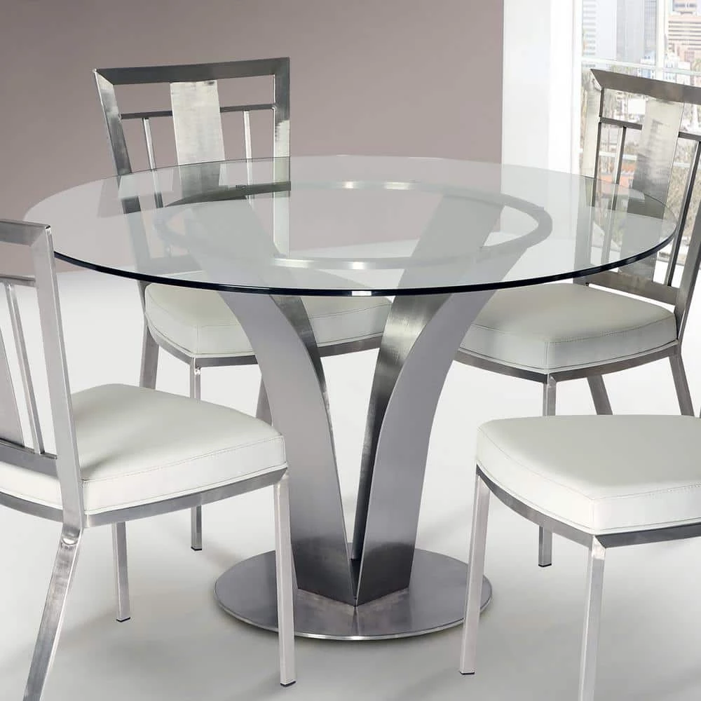 The Cleo round dining table with 48″ clear tempered glass top with stainless steel base is a beautifully made table that will add style and beauty to your dining area. The base of this dining set is beautifully constructed with even metal curved legs that are adjoined on a metal stainless steel base. It is sturdy, built to stun, and never makes for a boring dining experience. Add a touch of sophistication and glamour to your home with this modern dining table. Classically styled, this timeless pedestal table perfectly complements a modern and contemporary home dcor.
