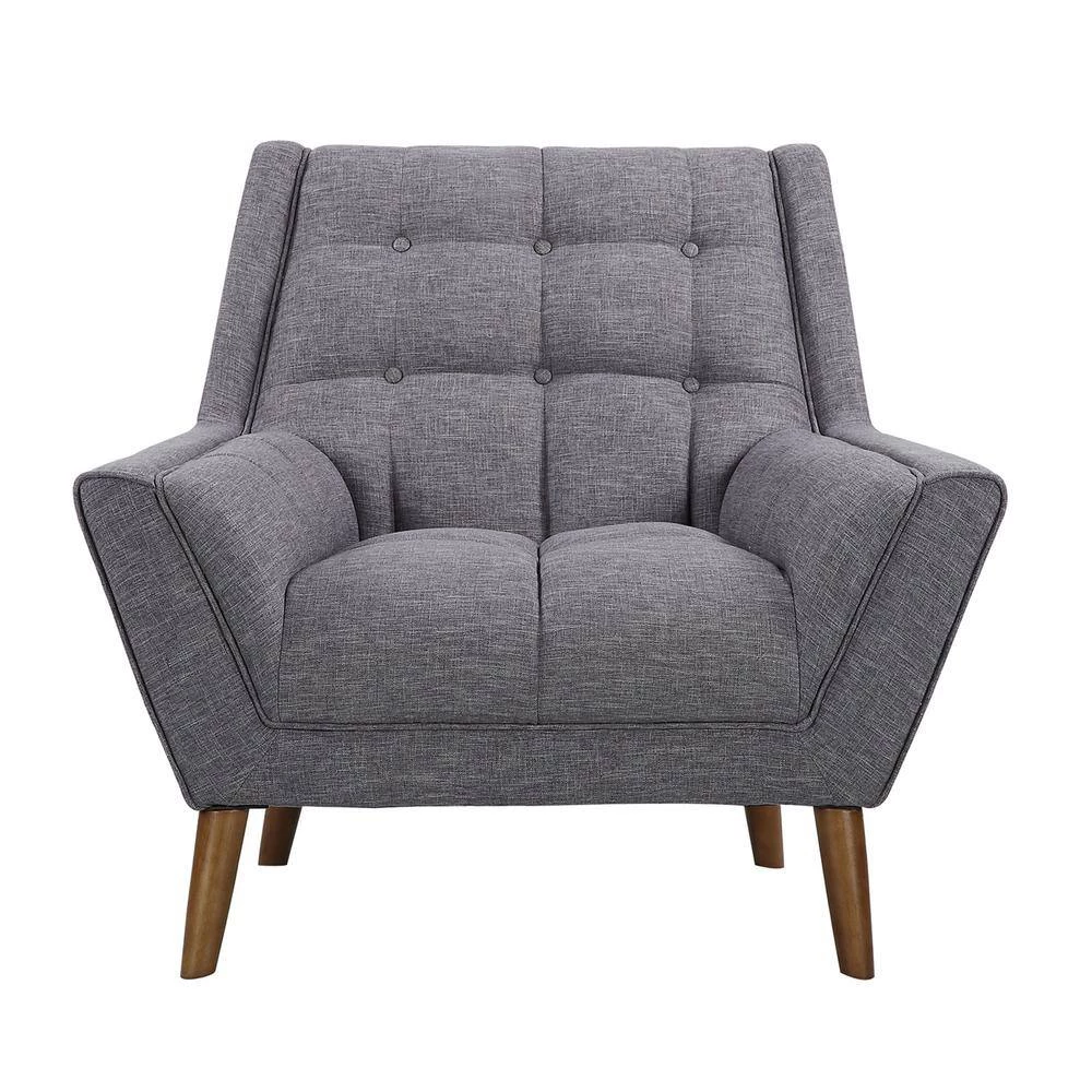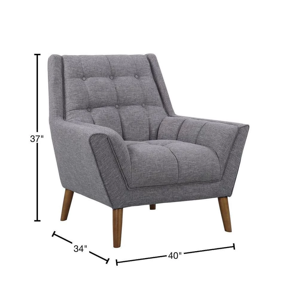 Looking for a chair that scales in comfort, style and size. Youll find that perfect combination in our Armen Living Cobra mid-century accent chair. It comes with low arms and a seat back and seat that includes threaded square patterns that makes this a distinctive looking chair. The unique Cobra chair is an epitome of modern and contemporary home furniture that gives you the feeling of home from it comfy cushions to its open, widespread arms and single bench line cushion. Its compact in style and can fit into narrow modern living spaces. It comes in neutral colors that allows it blend nicely without competing with your modern home design. You can add the Cobra sofa and loveseat to complete this collection in your home. Available in Dark Gray and Blue Linen Fabric upholstery.