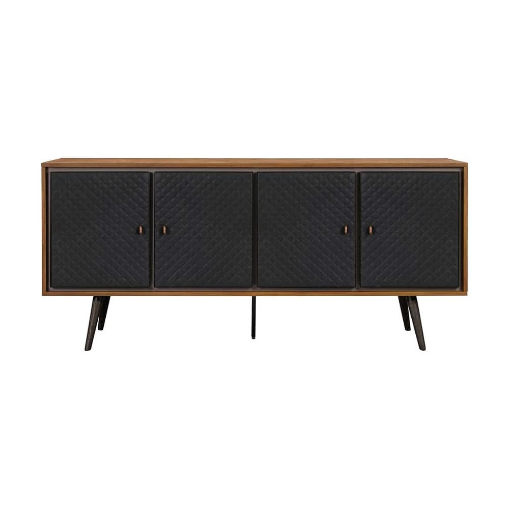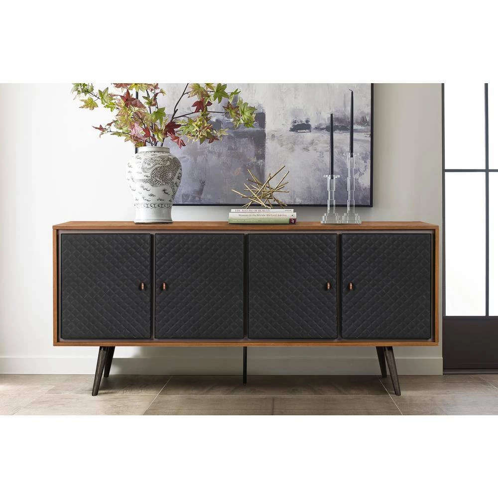 Offer up a touch of rustic and modern look to your dining or bar area with this Armen Living Coco Sideboard, it is a perfect piece for your traditional and welcoming space. The wood top design features a rustic wood grain look that goes along the side of this buffet. The four tapered leg based are design for sturdiness and durability. This spacious Sideboard feature 4 cabinets with soft close function. The front exterior details are tufted with diamond stitching design in black faux leather. This Sideboard will make a simple storage solution to any well-appointed space in your home. Perfect as a sideboard, credenza, buffet cabinet or display stand and can also accommodates flat-screen TVs up to 60″ wide as a living room or lounge area TV stand. This item is a part of the Armen Living Coco Bedroom collection but can be mixed and match in any modern style home.