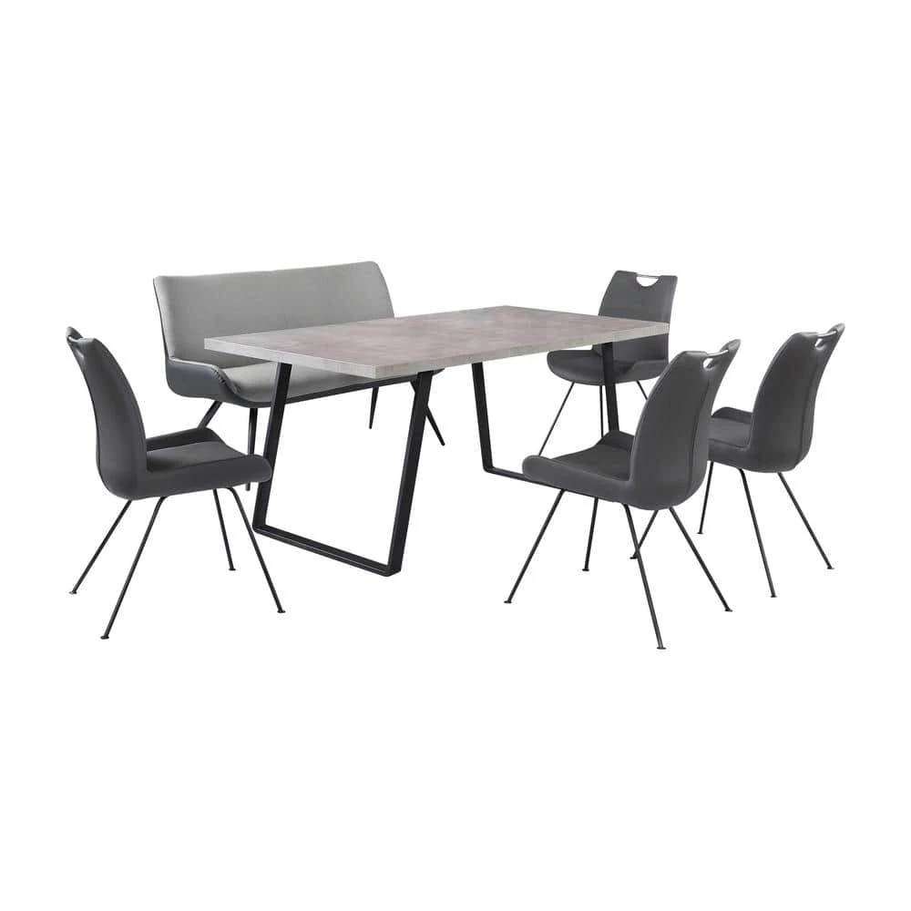 The Armen Living Coronado 6-piece dining set is both simple but elegant look that will complete any contemporary style dining room. The 6-piece set includes: The Coronado dining table, 4 faux leather dining chairs, and grey fabric/faux leather upholstery dining bench. The table has sleek metal base, complimented with a beautiful grey concrete laminate top. The Coronado dining chairs are complimented with soft faux leather upholstery for optimum comfort. The Coronado set is practical, yet highly appealing, making it the ideal combination for any contemporary dining room. We stand by the quality, the craftsmanship and the integrity of our product by offer 1-year warranty for all our products.