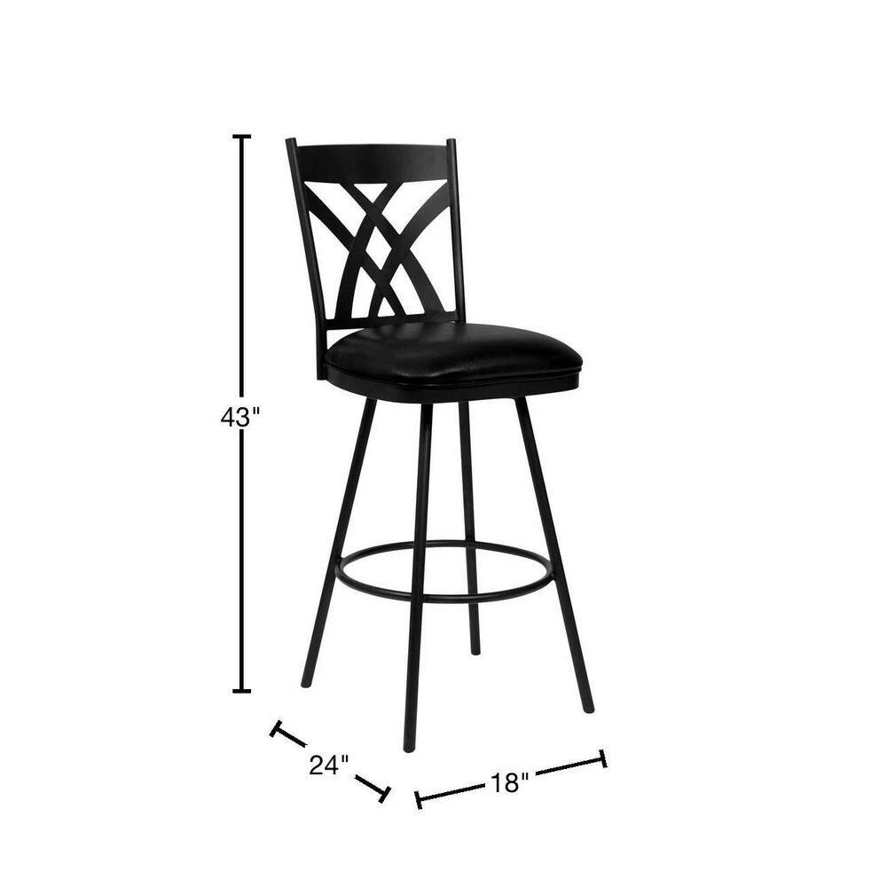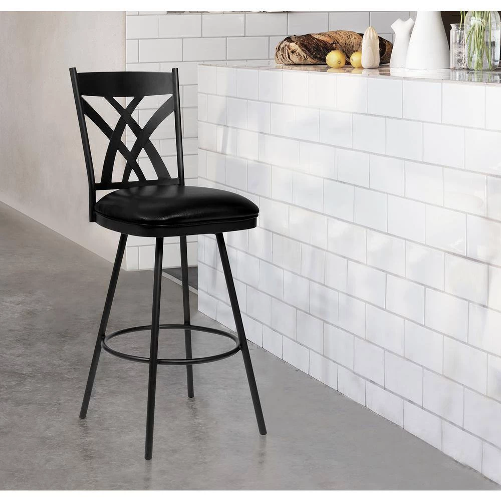 The Armen Living Dover mid-century armless Bar Stool is an essential piece for any modern household. The durability of the Dovers Matte Black finish metal frame construction is matched only the comfort of its Black faux leather upholstered seat. The Dovers tall, ornate back offers an exceptional degree of comfort while the 360° swivel seat allows for exceptional user mobility while seated. The included footrest provides an excellent accent to the straight leg design while also acting as a support piece. The Dovers legs are tipped with floor protectors, assuring that the Bar Stool will not slip on or scratch hardwood or tile floors. The elegant Dover is available in 2-industry standard sizes; 26 in. counter and 30 in. bar height.