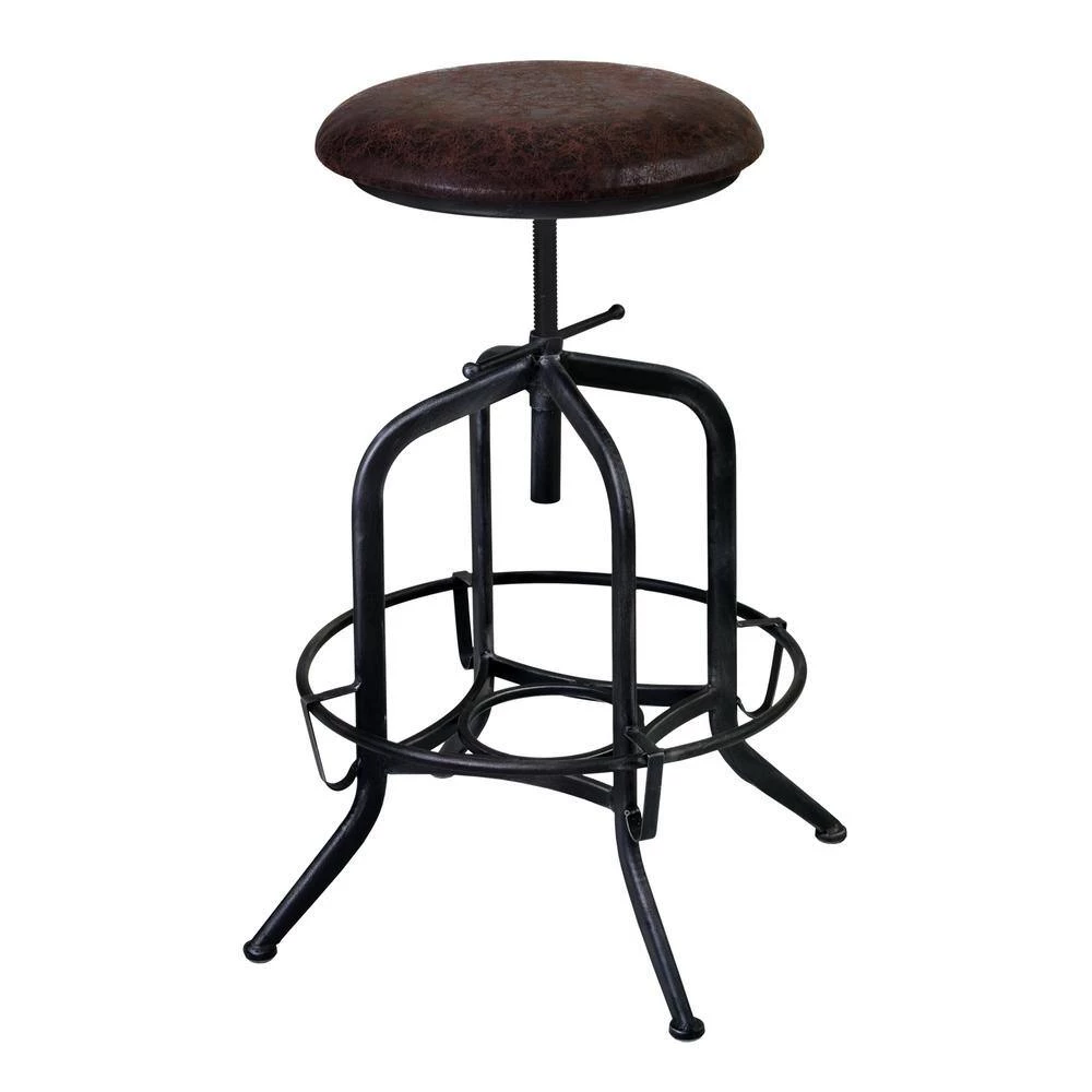 - Backless round industrial metal barstool with distressed warm Brown fabric