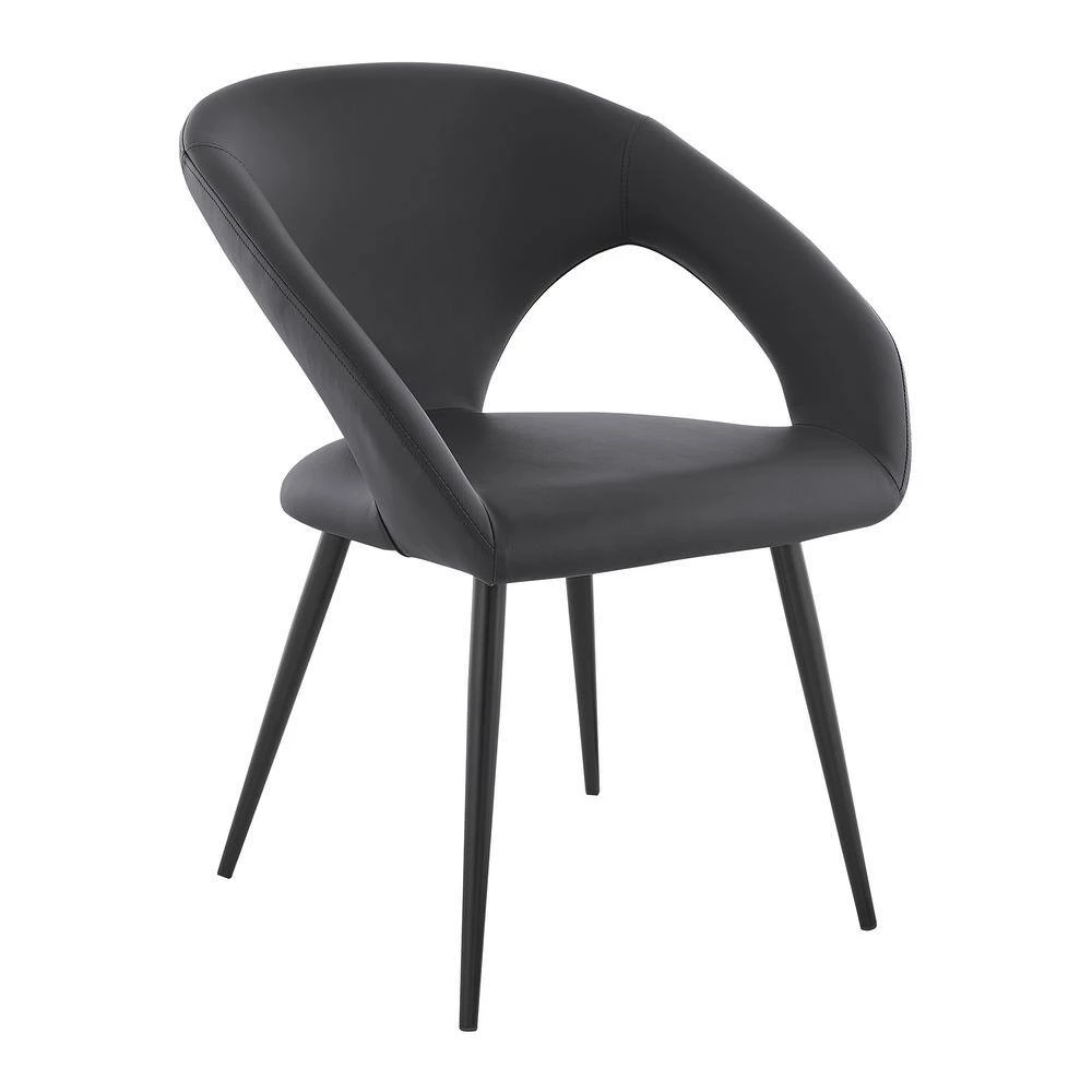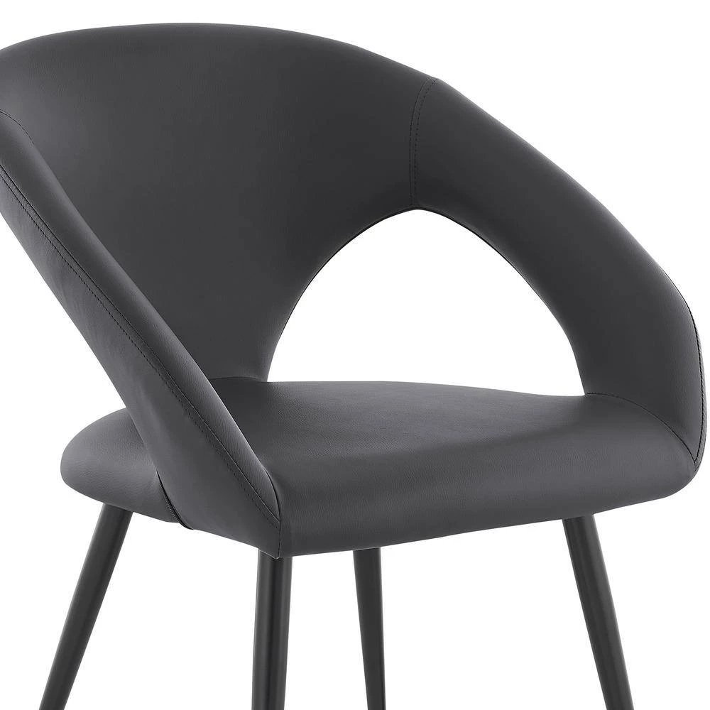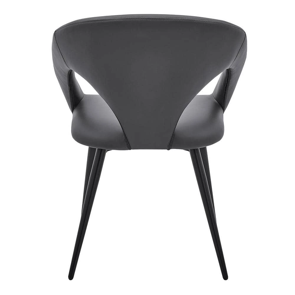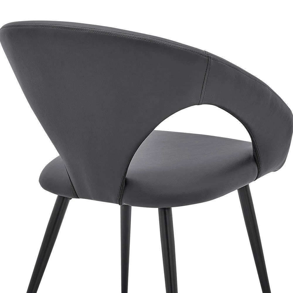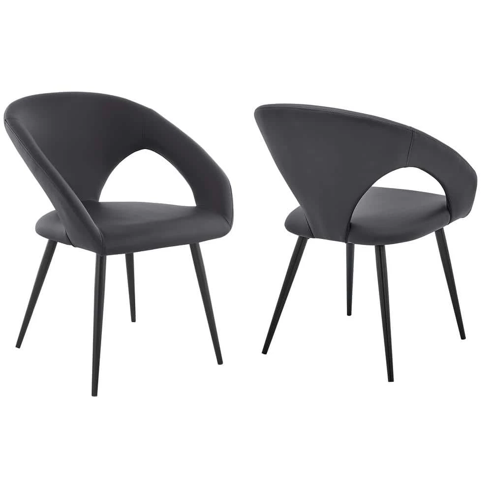 The Elin Grey Faux Leather and Black Metal Dining Room Chairs from Armen Living is the sophistication and refinement your dining room has been looking for. The seatback is curvy and clean – leaving you with a unique image of exuberance. The Elin features slotted sides that offer you an incredibly breathable seating experience. The metal frame is strong and stable and its accents are pleasing to the eye. The seat cushion is filled with foam padding – keeping you and your guests comfortable and relaxed while you visit with them. The Elin dining chairs come as a set of 2.