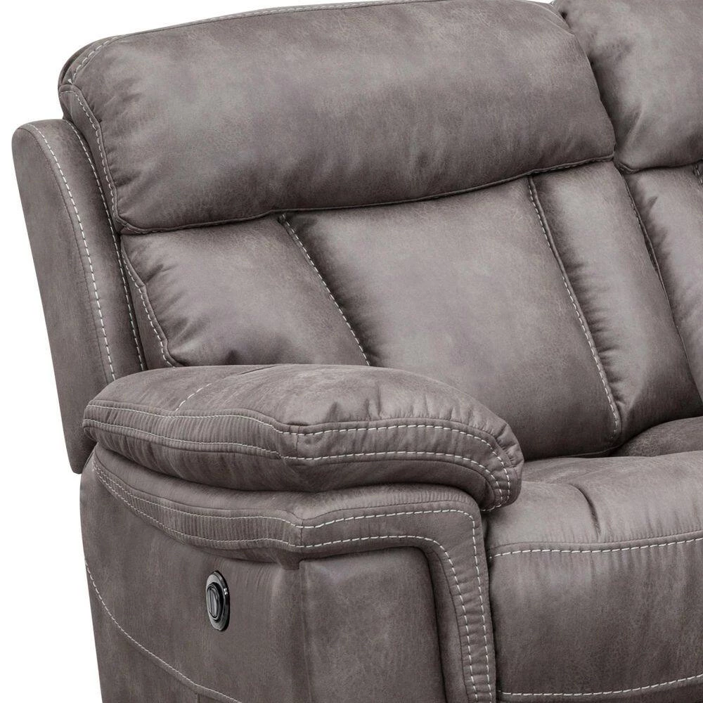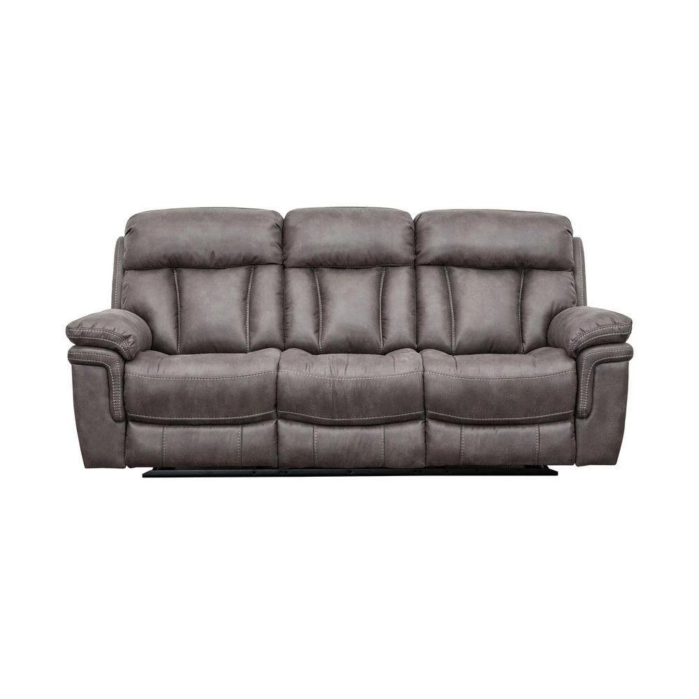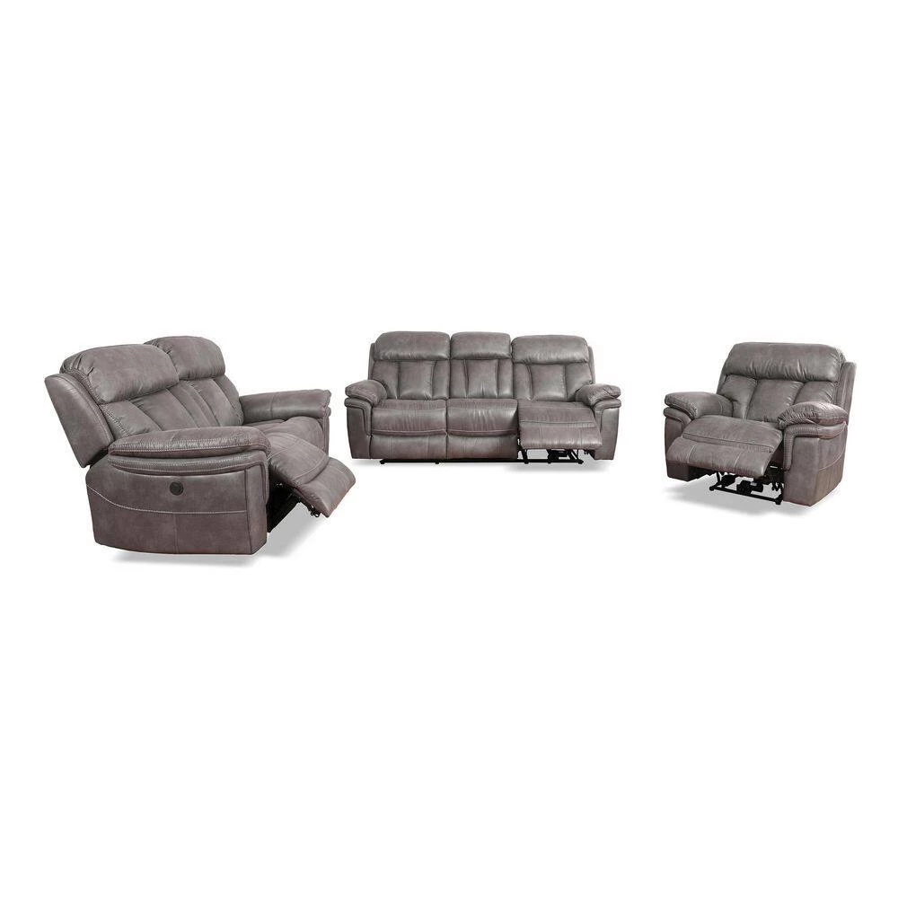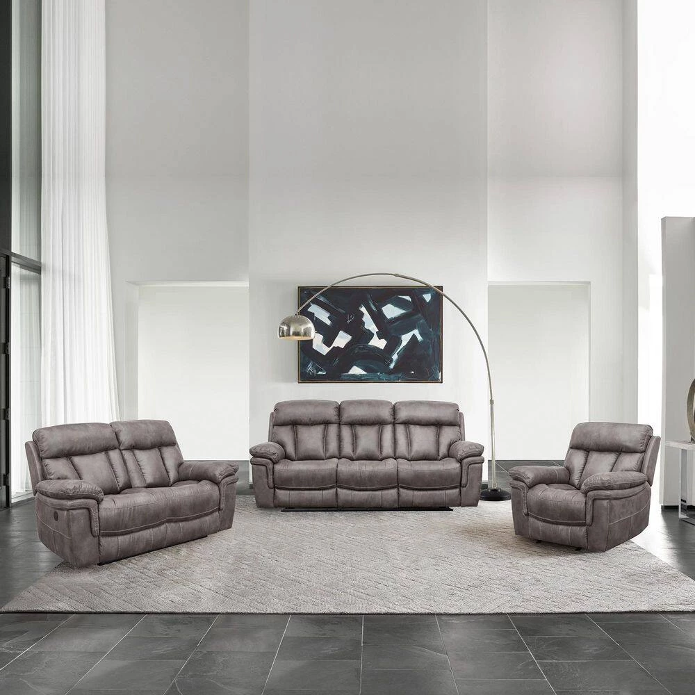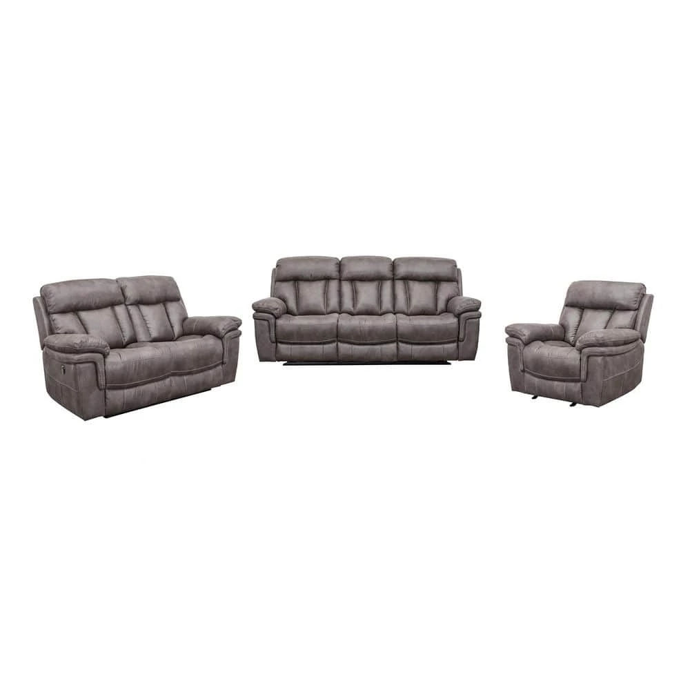 Create a cohesive space in your home or apartment with the Estelle Living Room Sofa Set from Armen Living. This seating set includes 1 chair, 1 loveseat and 1 couch with power reclining functionality. The fabric upholstery is welcoming, soft and luxuriously covers this reclining chair, love seat and sofa. Whether you are enjoying the big game, lounging with the latest bestseller or settling down to nap the afternoon away, a recliner chair and couch is key. The solid pine wood frame ensures the chairs durability and the sinuous spring system will provide unmatched comfort and support. This power recliner sofa set is great for anyone, big man recliners, love seats and sofas can be hard to find but this electric recliner set will accommodate anyone. The long-term durability of polyester makes it the perfect choice of upholstery fabric for families with children and pets. Polyester upholstery is water repellent, stain resistant, budget friendly and less prone to discoloration, ensuring your oversized recliner chair, loveseat and sofa will last for many years. Oversized headrests and armrests provide deep pockets of comfort while the convenient reclining feature provides a relaxing pose. Redefine a move night in your home with this beautiful 3-piece set. The Estelle 3-Piece Living Room Set from Armen Living is available in a Gunmetal fabric upholstery and makes a great addition to any home theater, living room, den or man cave.