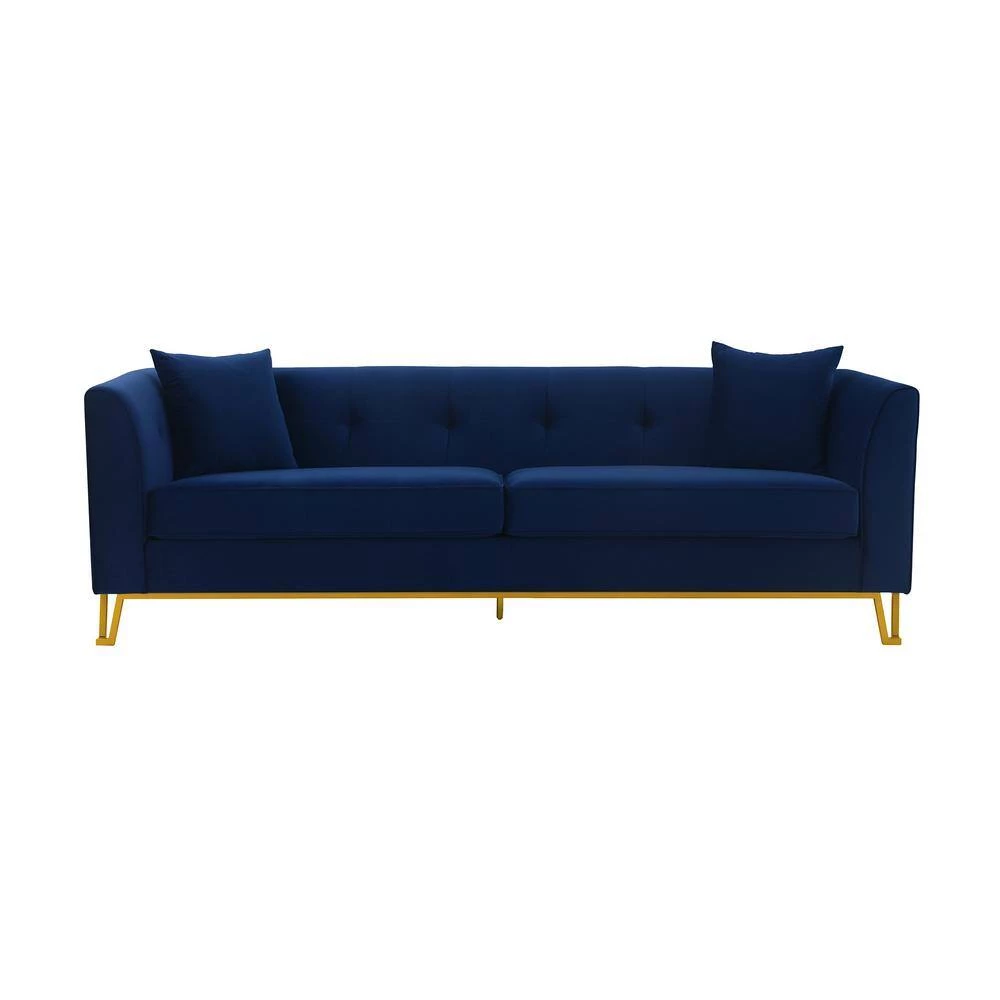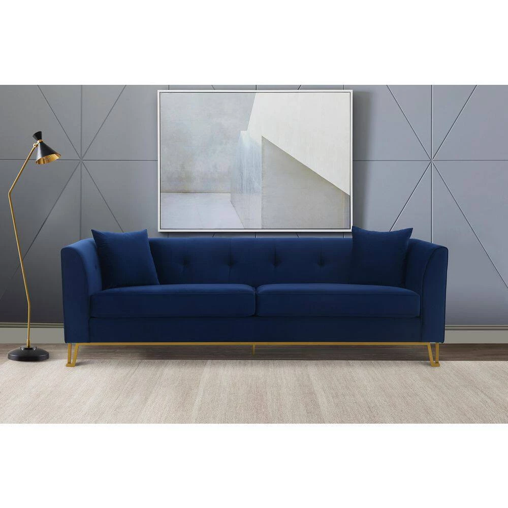 The Armen Living Everest Sofa is the seating option your home needs right now. Capable of accommodating up to four people with its high weight capacity, the wide seat and high chair back and arms will encapsulate your body and make you feel satisfied and secure. The incredibly comfortable foam-padded cushions of the Everest Sofa will keep you relaxed all day long and make you never want to get up! The striking brushed gold legs are a stand-out feature that compliments the fabric upholstery perfectly, while also adding to the uniqueness of this sofa. This wonderful chair comes with two additional toss pillows to accessorize with. The Everest is available in your color choice of Blue, Gray, and Blush fabric.