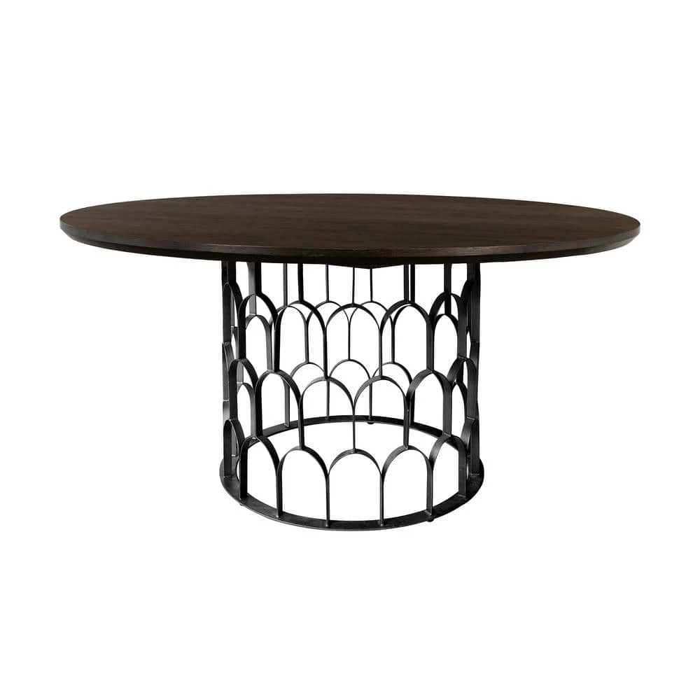The Armen Living Gatsby Oak and Metal Round Dining Table is 55 in. in diameter and easily seats up to 4-people. This table features a beautiful metal base with a warm oak top allowing it to easily fit in to any current design theme in your home. The Gatsby Dining Table is also available with a concrete top.