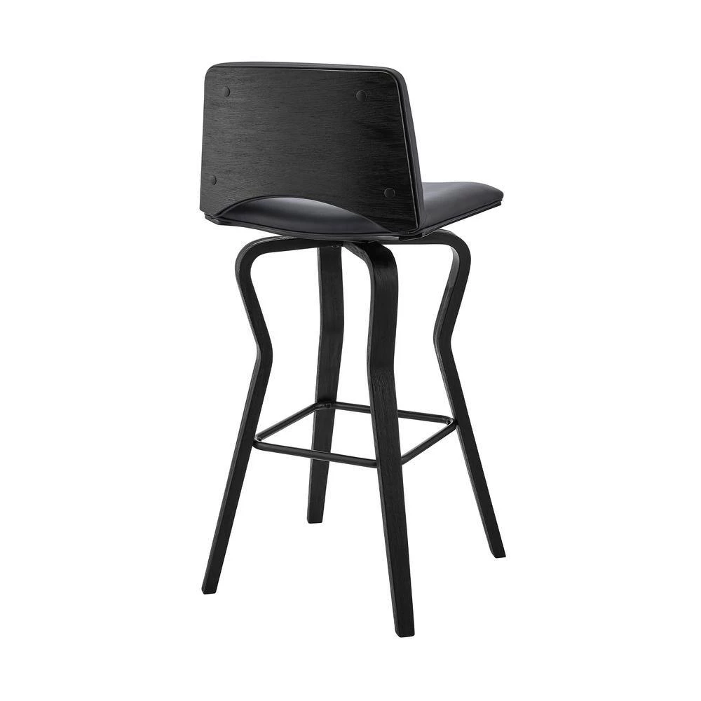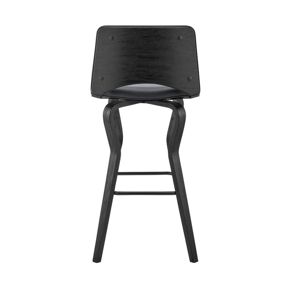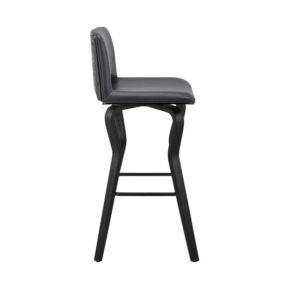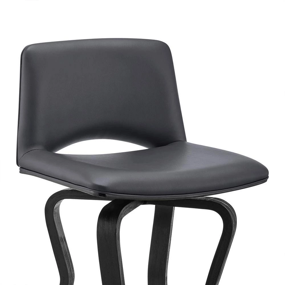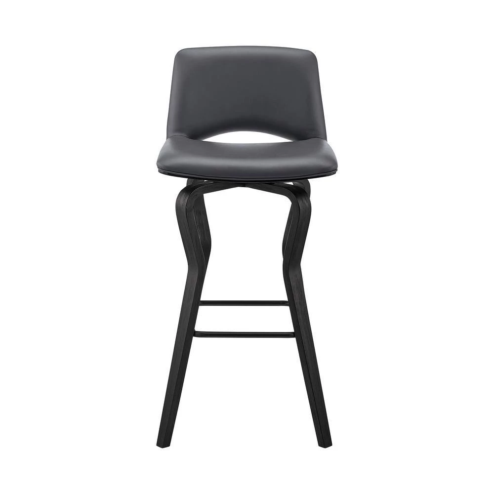 Gather your family and friends and seat them in the Gerty 30 in. Swivel Gray Faux Leather and Black Wood Bar Stool from Armen Living. This wonderful bar stool is crafted to be breathable, with its slotted back, as well as functional, with the 360° swivel function for full mobility. The faux-leather upholstery is soft, yet durable – covering the soft foam-padded seat and back, giving you the look, feel, and longevity you have always been looking for. The legs are crafted to be durable sturdy, doing all the work for you by maintaining themselves for many years to come. The armless design of the Gerty allows you to easily pull this stool up to your kitchen island, home bar, or peninsula counter. The Gerty also features a metal footrest for extra comfortability. The Gerty is available in 26 in. or 30 in. seat height and comes in your choice of Gray faux leather and black wood, cream or Gray faux leather with walnut wood.