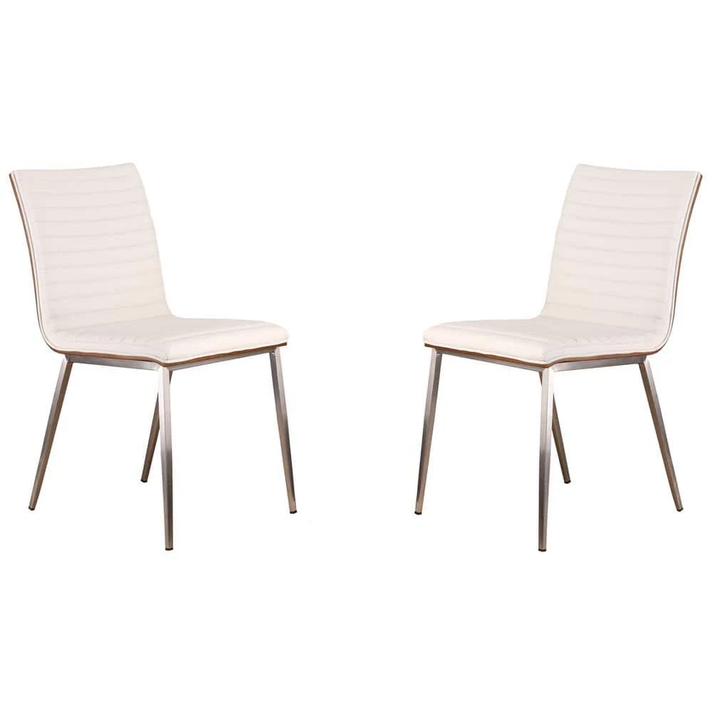 The Armen Living Haddy contemporary dining chair is a perfect statement piece for any modern dining room. This clean, elegant chair combines a fauxleather upholstered, walnut veneer seat with an exquisite brushed stainless steel frame. This wonderful combination of top of the line materials makes the Haddy a standout piece. While perfect when set around a table, this versatile and stylish piece of furniture can easily double as additional seating in any room in the house. The Haddy is available in gray and white.