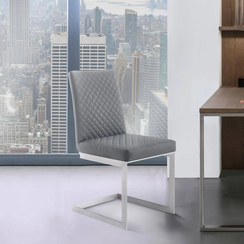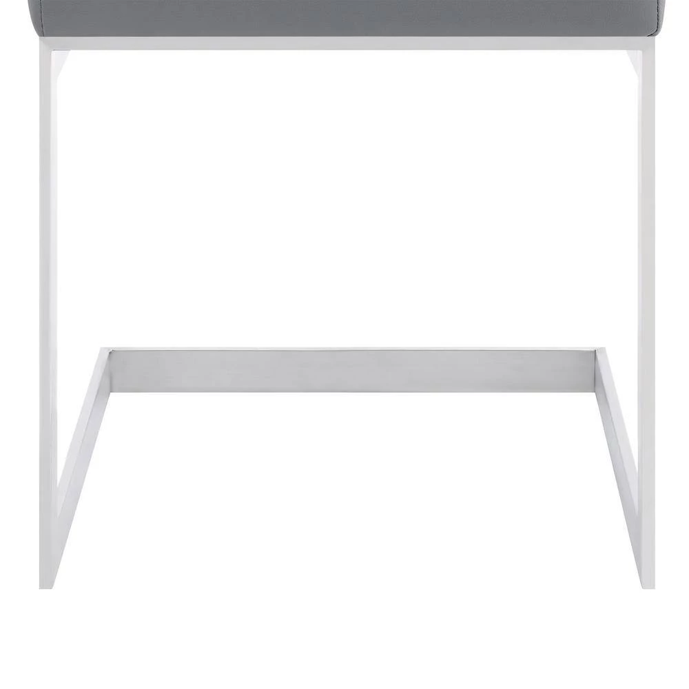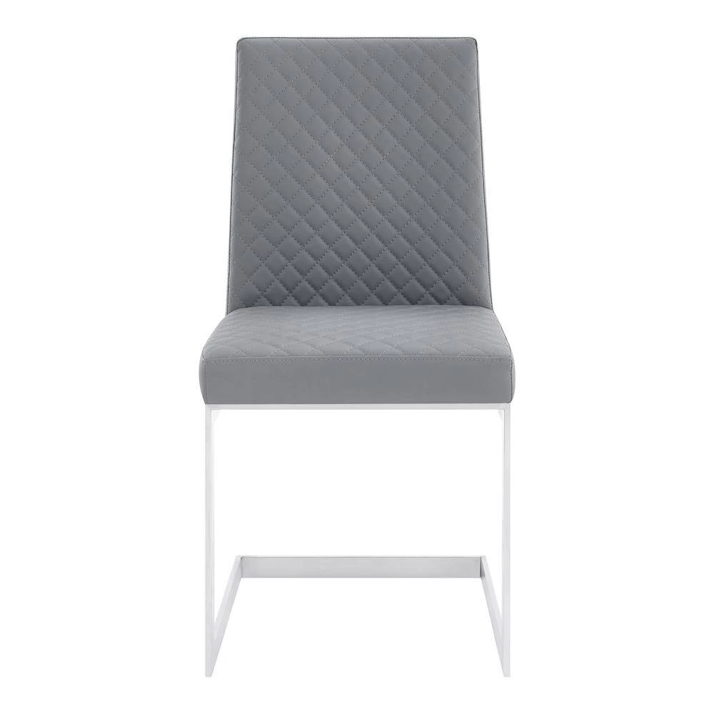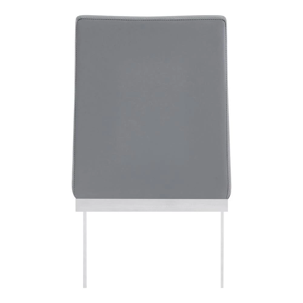 The Armen Living Hester contemporary dining chairs are designed for elegance, comfort, and durability. Its unique shape makes the Hester a standout item that is sure to add extra flare to the modern dining room or kitchen. These luxurious chairs include a plush, cushioned grey faux leather seat and back as well as a robust brushed Stainless-Steel frame. The Blanca is sold in a set of 2.