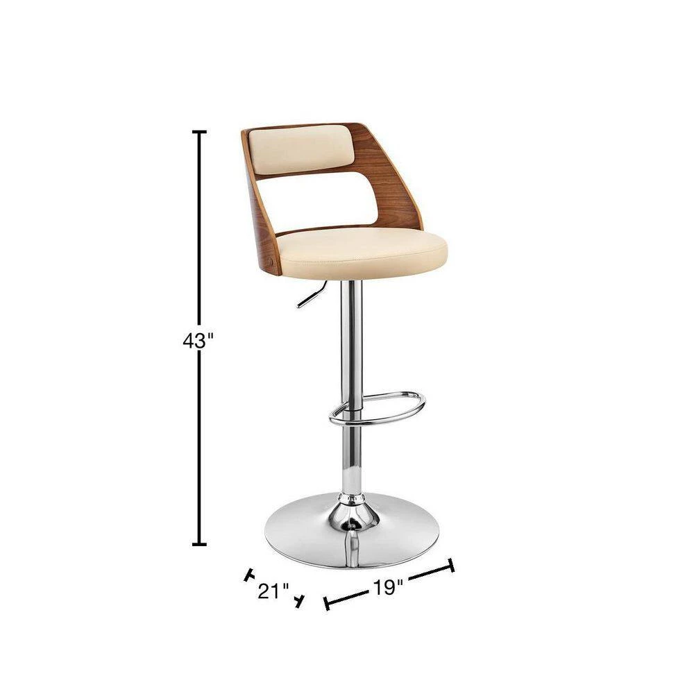 The Itzan Adjustable Swivel Cream Faux Leather and Walnut Wood Bar Stool with Chrome Base is the ideal addition to any home or apartment. The wide seat and ergonomic design is capable of keeping you comfortable and relaxed as long as you like. This stool combines mid-century aesthetics with a dash of retro chic glamour. The adjustable seat height functionality allows you to use this stool at your kitchen island, home bar, or peninsula without having to worry about the surface height. The convenient swivel function optimizes everyday use or entertaining, keeping everyone engaged regardless of their place in the room. The plush padded and high-density foam seat and back rest atop a strong pedestal base that creates a sturdy and comfortable seating experience. The Itzan is available to you in Gray faux leather with black wood and a black base, cream or Gray faux leather with walnut wood and a chrome base.