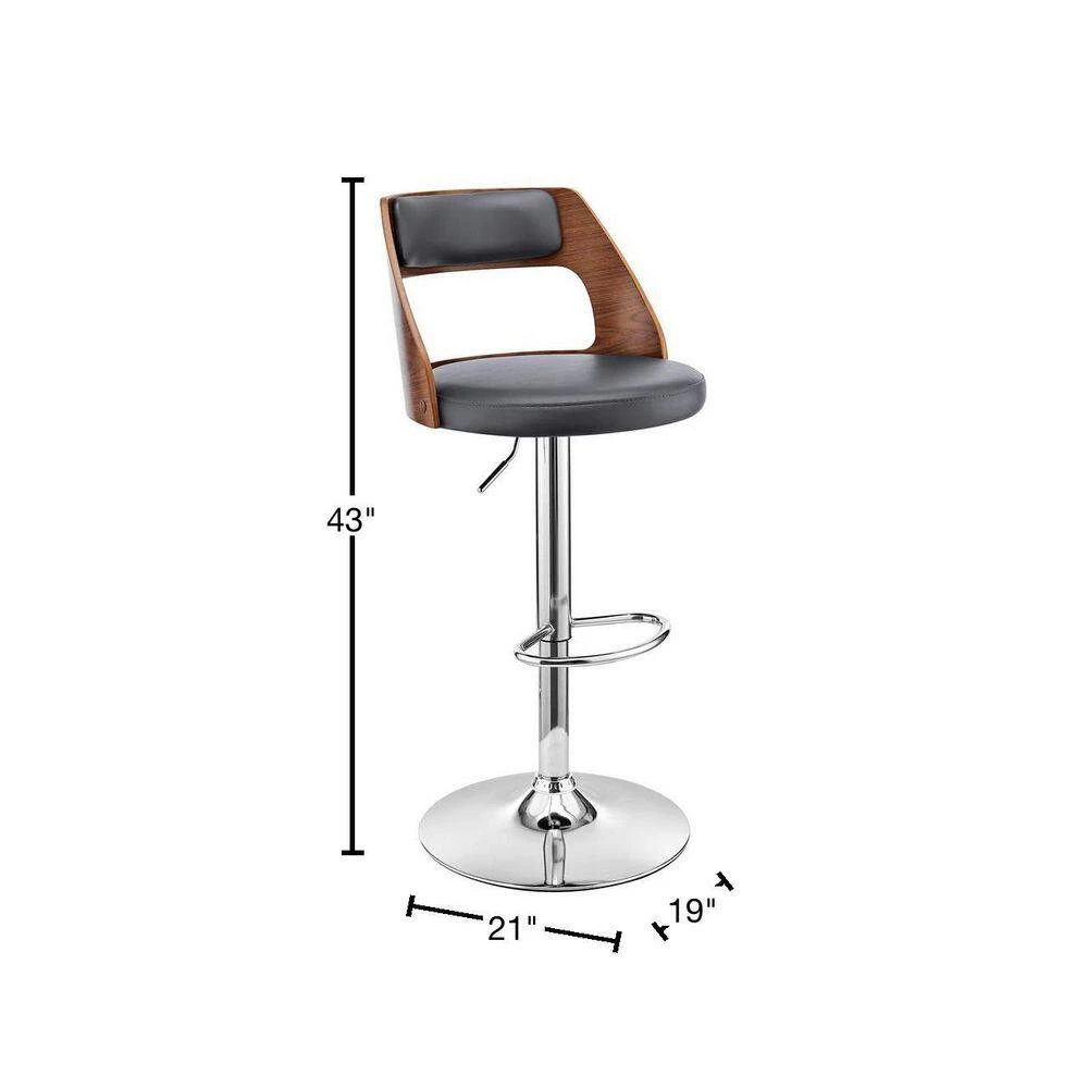 The Itzan Adjustable Swivel Gray Faux Leather and Walnut Wood Bar Stool with Chrome Base is the ideal addition to any home or apartment. The wide seat and ergonomic design is capable of keeping you comfortable and relaxed as long as you like. This stool combines mid-century aesthetics with a dash of retro chic glamour. The adjustable seat height functionality allows you to use this stool at your kitchen island, home bar, or peninsula without having to worry about the surface height. The convenient swivel function optimizes everyday use or entertaining, keeping everyone engaged regardless of their place in the room. The plush padded and high-density foam seat and back rest atop a strong pedestal base that creates a sturdy and comfortable seating experience. The Itzan is available to you in Gray faux leather with black wood and a black base, cream or Gray faux leather with walnut wood and a chrome base.