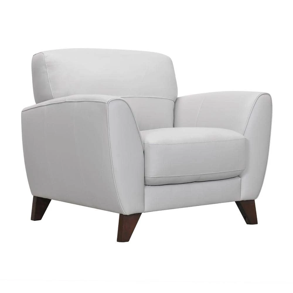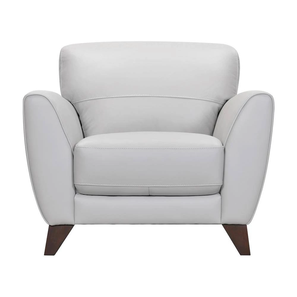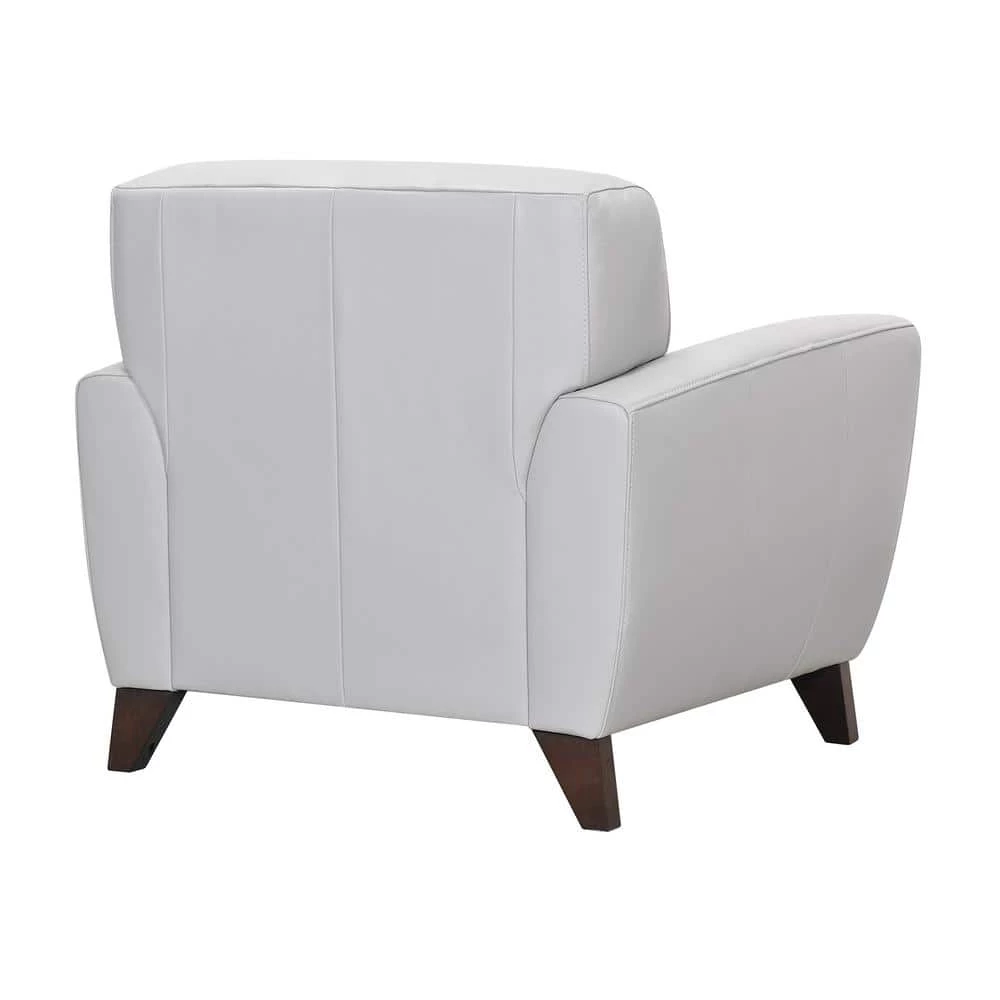 The Armen Living Jedd contemporary genuine leather chair is a sophisticated choice for any modern household. The plush back and seat of the Jedd is padded with Dacron, assuring that the genuine cowhide leather upholstery remains crack and wrinkle free while also providing an exceptional degree of comfort. The Jedds legs are made of durable hardwood and their beautiful brown wood finish compliments the leather fabric without detracting from the quality of the Jedds construction. Sleek, stylish and immaculately designed to deliver a perfect coupling of durability and relaxation, the Jedd is a wonderful choice for any contemporary home. For a cohesive living room aesthetic, consider pairing the Jedd chair with the accompanying loveseat and sofa. The Jedd is available in Dove Grey leather accented by beautiful white stitching.