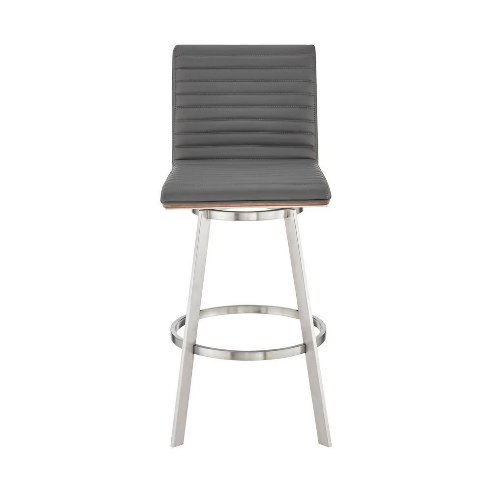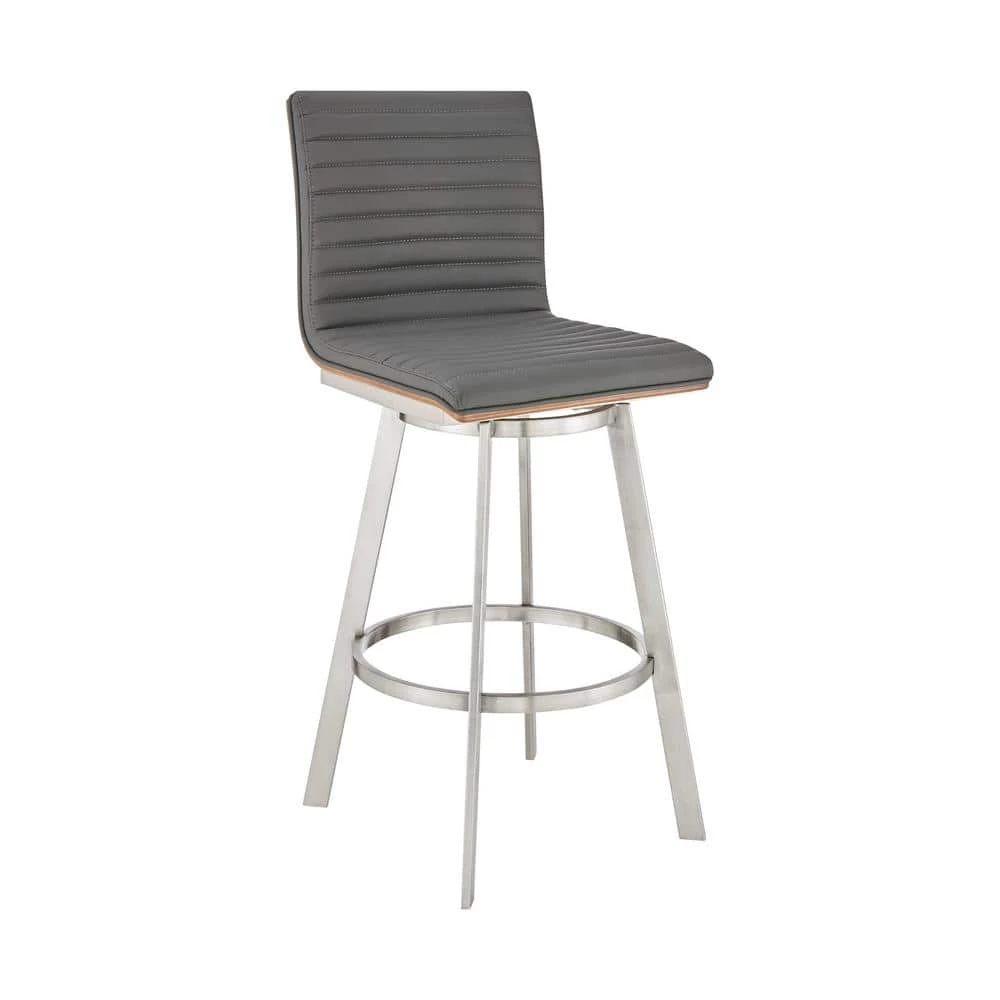 Bring the Jermaine Swivel Bar Stool from Armen Living into your beautiful home It is the best choice to bring in another seating option and does so without compromising on comfortability. The wonderful faux leather and metal accents give the Jermaine a look of refinement, making you proud to show it off in your home. The foam-padded seat and back cushion offers you the most comfort available to you The Jermaine also features a brushed wood veneer back and convenient metal footrest, for additional support and stability. The Jermaine comes in a variety of color and finishes; gray faux leather with black metal or brushed stainless steel finishes and black brushed wood back, or walnut finished back. All color options are available in your choice of 26 in. counter height and 30 in. bar height.