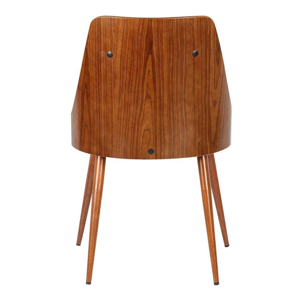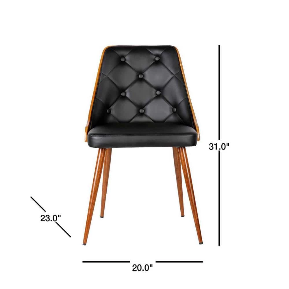 The Armen Living Lily mid-century dining chair is designed to add sophistication to any contemporary home decor. The curved hardwood walnut back is upholstered with soft faux leather and sports a beautiful diamond button tuft, wrapping you in comfort while you dine or entertain. This modern side chair features walnut finished legs which combine the durability of metal with the natural beauty of wood. The Lily is available in your choice of black or gray faux leather.