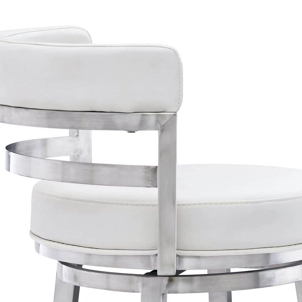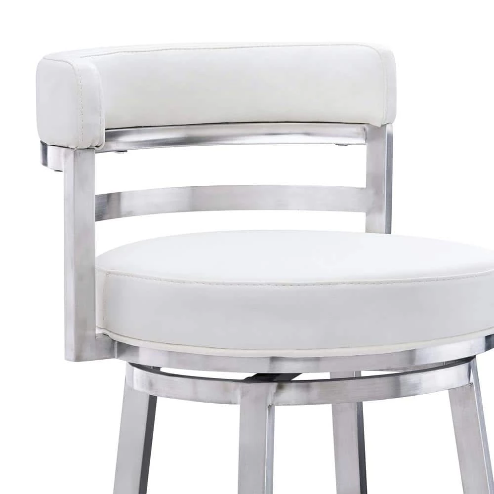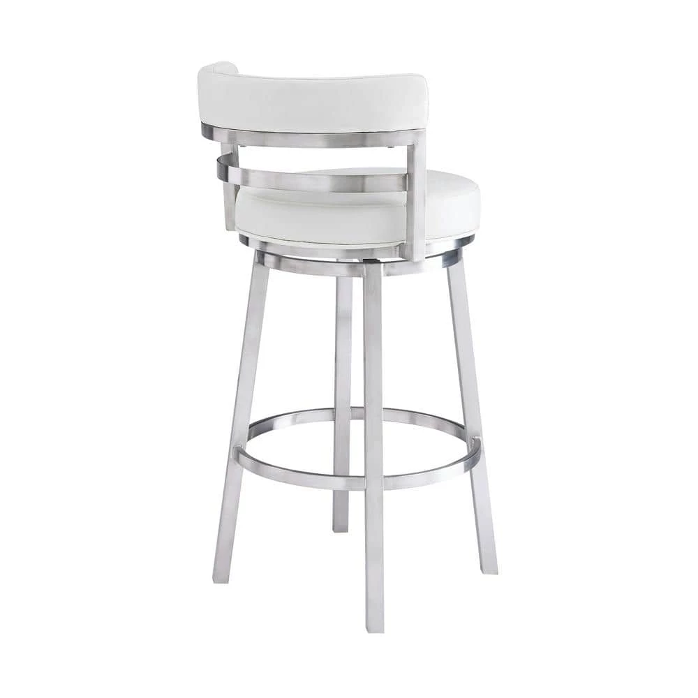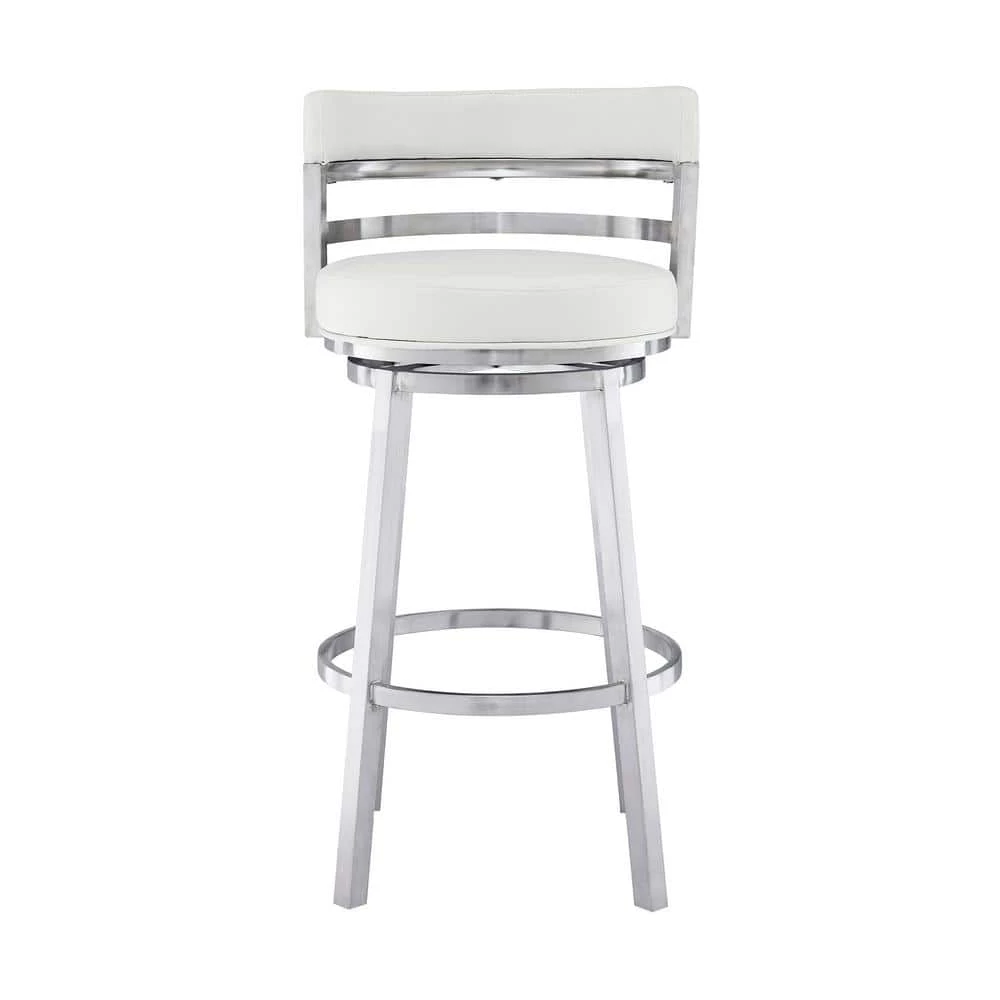 The Armen Living Madrid armless Bar Stool features a unique aesthetic that is certain to work well in any modern household. The Madrids durable brushed stainless steel frame is accompanied beautifully by its white faux leather seat and back. The upholstered low back is rounded, providing the user with exceptional support while the 360° swivel seat allows for enhanced mobility. The Madrids contemporary straight leg design endows the Bar Stool with a chic quality that is further accented by the inclusion of a round footrest. The Madrids legs are tipped with floor protectors, assuring that the Bar Stool will not slip on or scratch hardwood or tile floors. The beautiful Madrid is available in 2-industry standard sizes; 26 in. counter and 30 in. bar height.