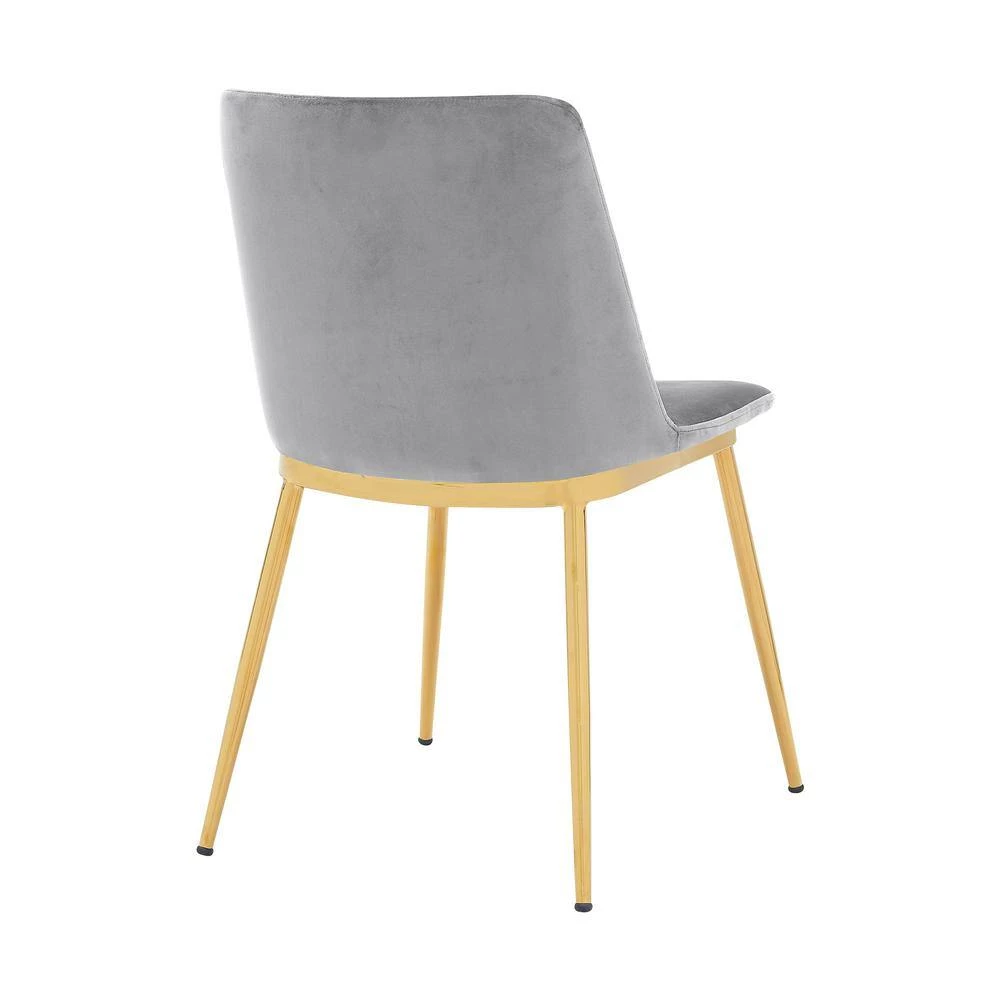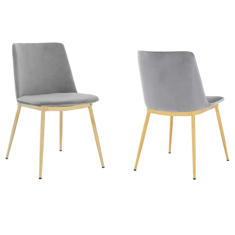 The Armen Living Messina Modern Velvet and Gold Metal Leg Set of 2 Dining Room Chairs is a necessity for any modern or contemporary household. The soft velvet upholstery is smooth to the touch but durable to last with everyday wear and tear. These chairs feature plush foam padding for the most comfortable seat cushion around. The high chair back offers excellent lumbar support that keeps your back properly aligned and feeling great. The beautiful black metal legs are accented by gold highlights, which add a look of refinement to this piece. The versatile look allows you to add these chairs to any room in your home and will make a statement. The Messina Barstool is offered in your choice of Jewel Blue, Gray, Rose Pink, and White Gray.