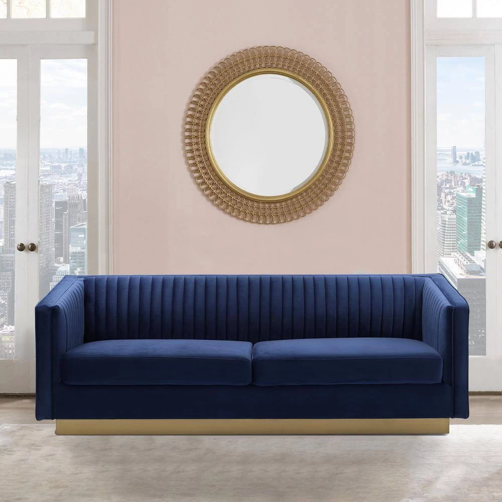 Make a chic statement in your living room with The Armen Living Miranda Velvet Sofa. Featuring a sleek silhouette, the Miranda is upholstered in a rich velvet fabric that feels exceptionally soft to the touch. Channel tufting highlights the stunning sheen in the velvet, while the striking antique gold finished metal base anchors the glamorous look of this sofa. The Armen Living Miranda Sofa is available in your choice of Blush, Dark Grey or Navy velvet upholstery.