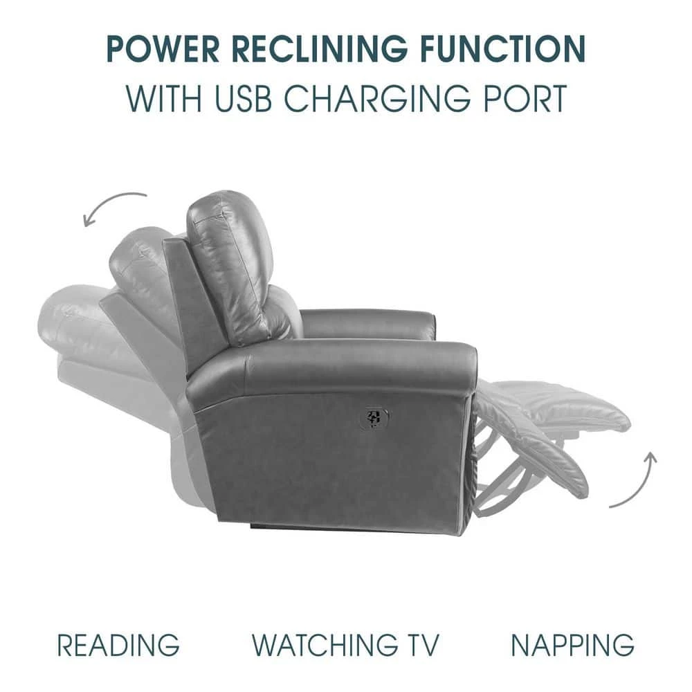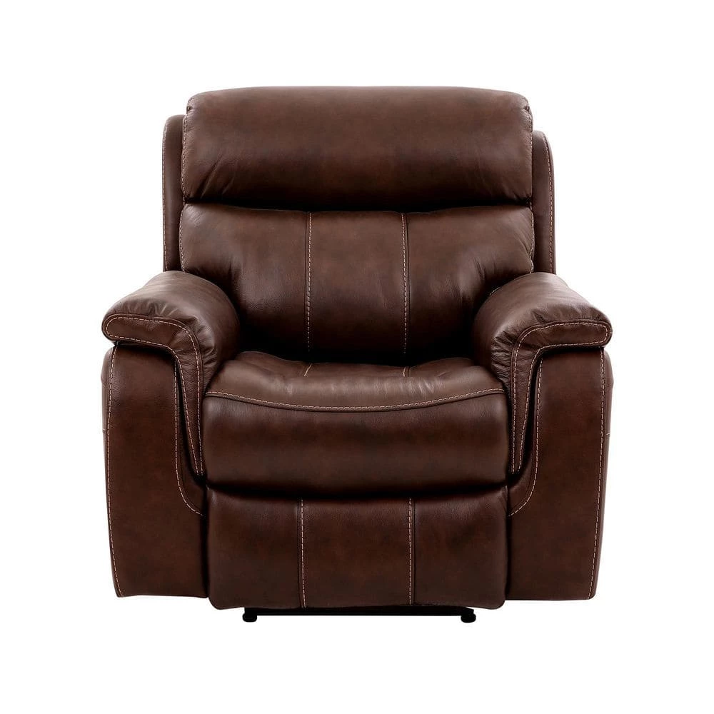 The Montague Dual Power Leather Recliner Chair in Brown from Armen Living instantly adds a touch luxury and comfort to your home or apartment. Dual power furniture uses two motors for optimal comfort: one controlling the headrest and 1 controlling the footrest. This allows you to find the optimal position for movie night or the big game. These types of recliners also require a power source and function with push button operation. This living room chair is upholstered in genuine leather that exudes a butter soft texture and can easily be cleaned. Genuine leather outlasts other upholstery furniture as it’s a flexible and strong material, making it resistant to tears and punctures. This leather recliner can last for decades if cared for properly and allows you to create a hypoallergenic environment. The solid pine wood frame ensures the chairs durability and it’s sinuous spring system will provide unmatched comfort and support. The foam seat and pillow-top arms enhance relaxation. With the push of a button, you can adjust your headrest to find the perfect angle for reading or watching TV. This control over your comfort helps you avoid neck strain and keeps your head supported. The Montague collection features a leather recliner chair and a reclining sofa, available together as a sofa set or individually. The Montague power recliner is available in brown genuine leather upholstery and makes an ideal addition to any living room, mancave, den, home office or nursery.