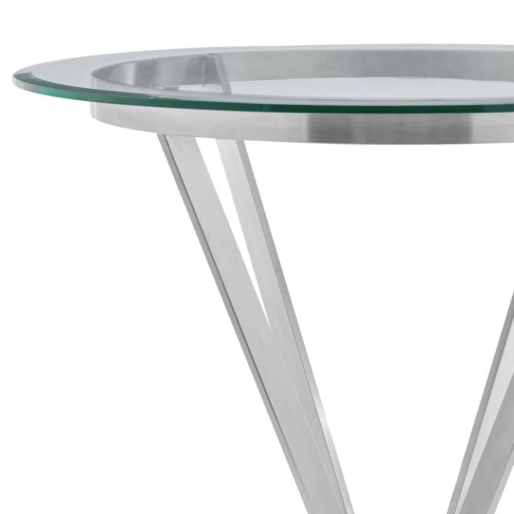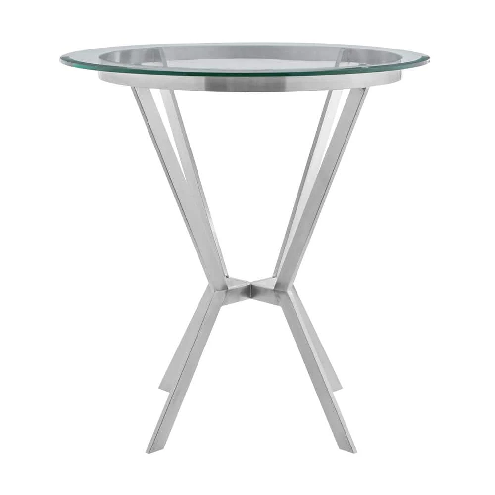 The Naomi Bar Table from Armen Living is a contemporary bar table that adds a touch of pure sophistication to a kitchen, bar or lounge area, or even a breakfast nook. It features a strong and striking stainless steel x-shaped base, giving it a sleek and stunning visual. The round tempered glass top completes the elegant look, while also contributing to the durability of this piece. Modern in style, this table is perfect for relaxing with a glass of wine aft.er work or enjoying an entertaining a small group of guests. Pair it with any of the bar stools from any of our collections at Armen Living.