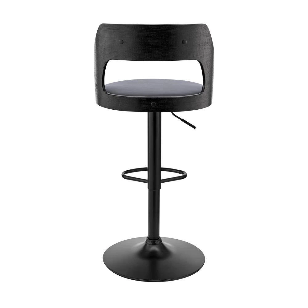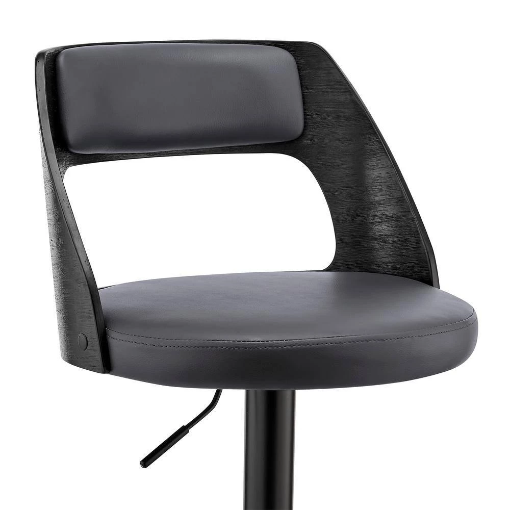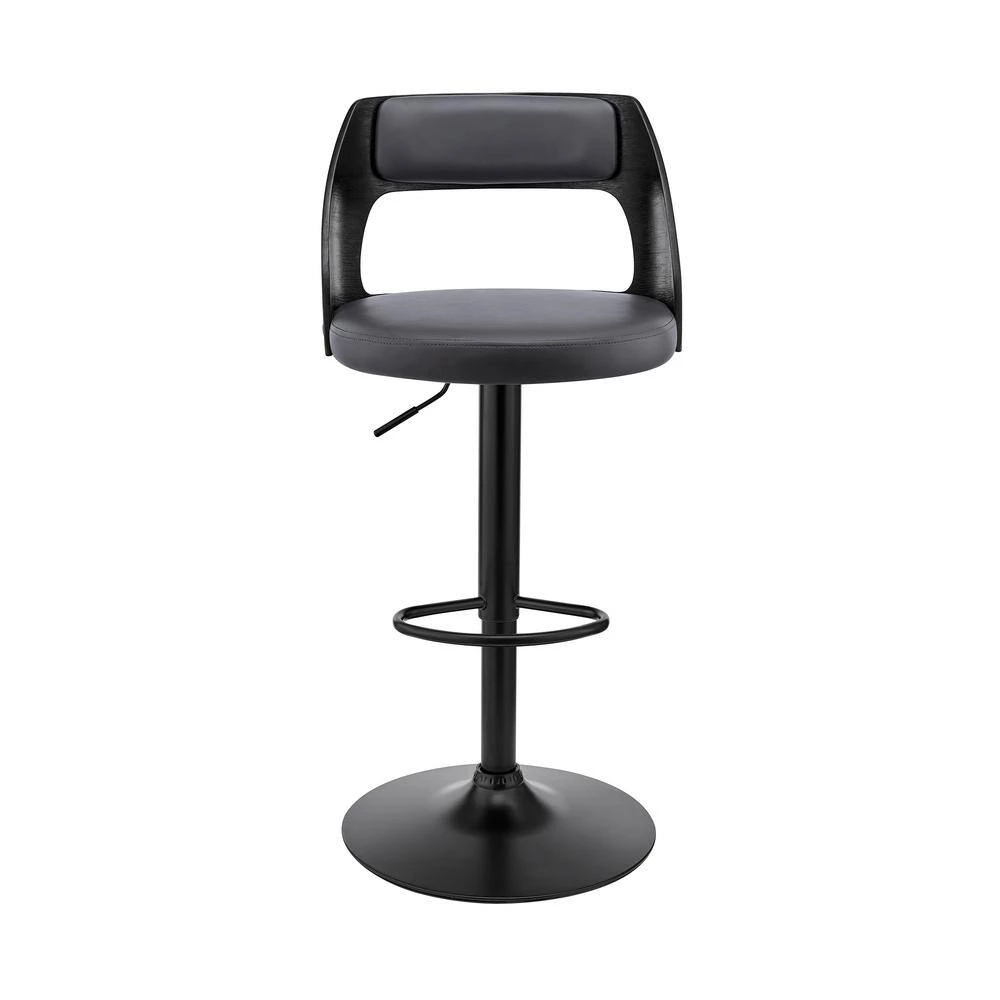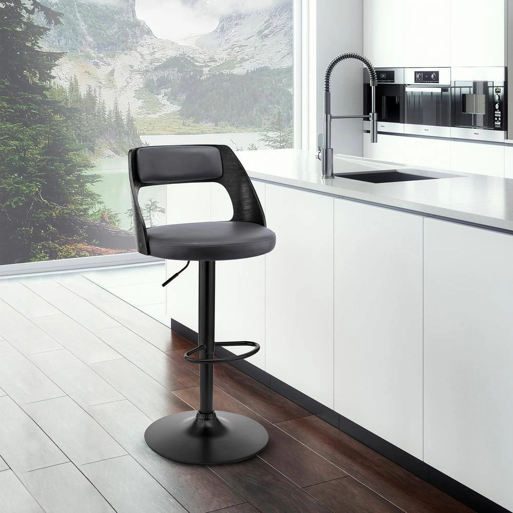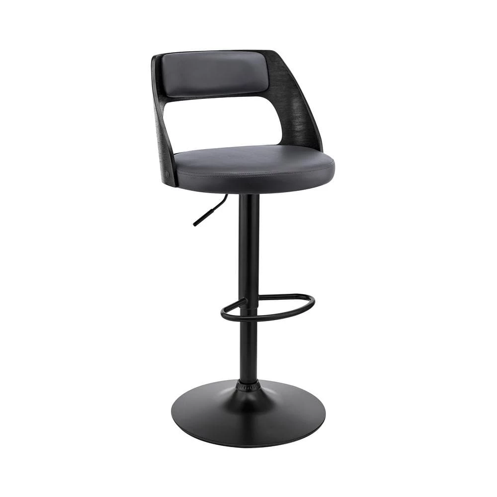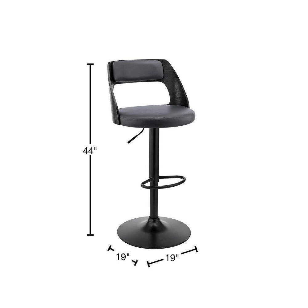 The Paulo Adjustable Swivel Gray Faux Leather and Black Wood Bar Stool with Black Base is the ideal addition to any home or apartment. The wide seat and ergonomic design are capable of keeping you comfortable and relaxed as long as you like. This stool combines mid-century aesthetics with a dash of retro chic glamour. The adjustable seat height functionality allows you to use this stool at your kitchen island, home bar, or peninsula without having to worry about the surface height. The convenient swivel function optimizes everyday use or entertaining, keeping everyone engaged regardless of their place in the room. The plush padded and high-density foam seat and back rest atop a strong pedestal base that creates a sturdy and comfortable seating experience. The Paulo is available in your choice of cream or black faux leather with walnut wood and a chrome base or cream or gray faux leather with black wood and a black base.