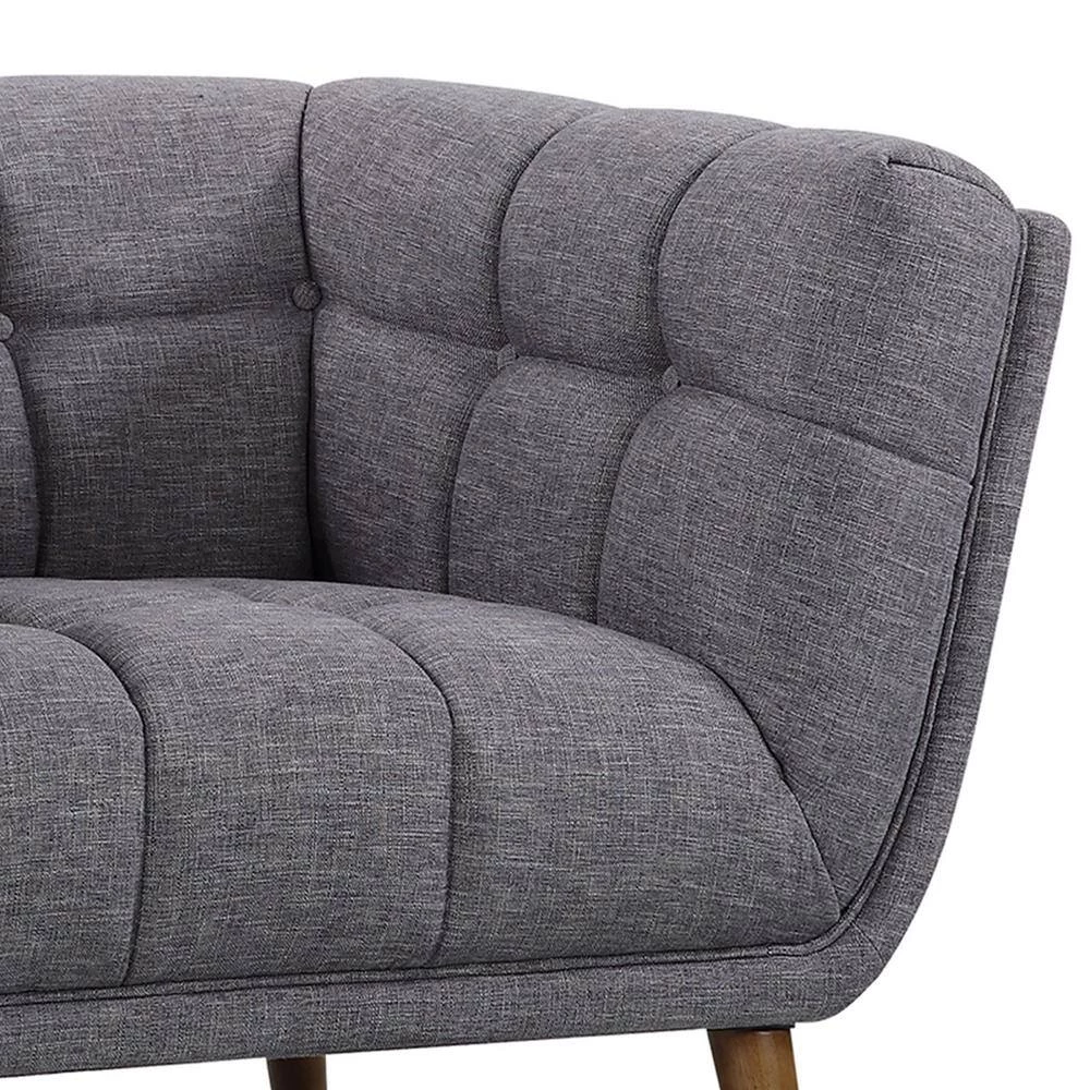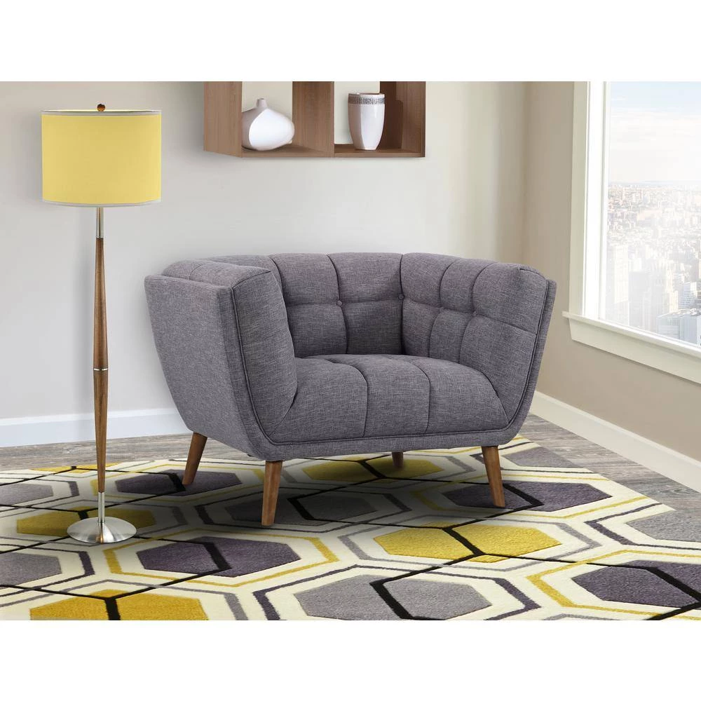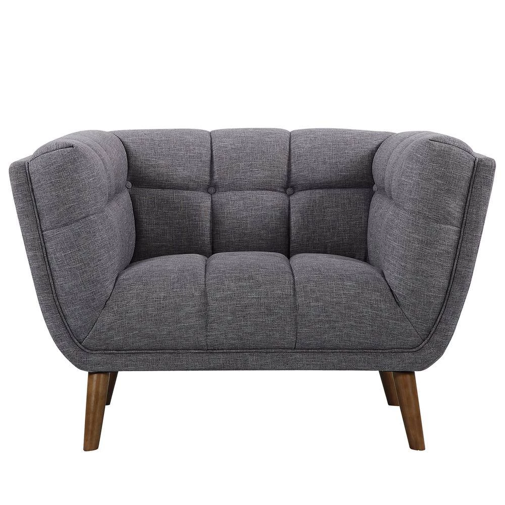 Heart-to-heart conversations, casual cocktail events and lounging happens on the best living room pieces. Thats exactly what our Armen Living contemporary Phantom chair offers. Designed according to the mid-century modern style, with an emphasis on imparting a sense of organic living in a modern space. The Phantom accent chair is outfitted with a flared out walnut wood legs and is upholstered in Dark Gray linen with tufted back and seat cushions that makes room for other hues of colors to be incorporated. It comes in a sofa and loveseat, which can be combined for a harmonious collection.
