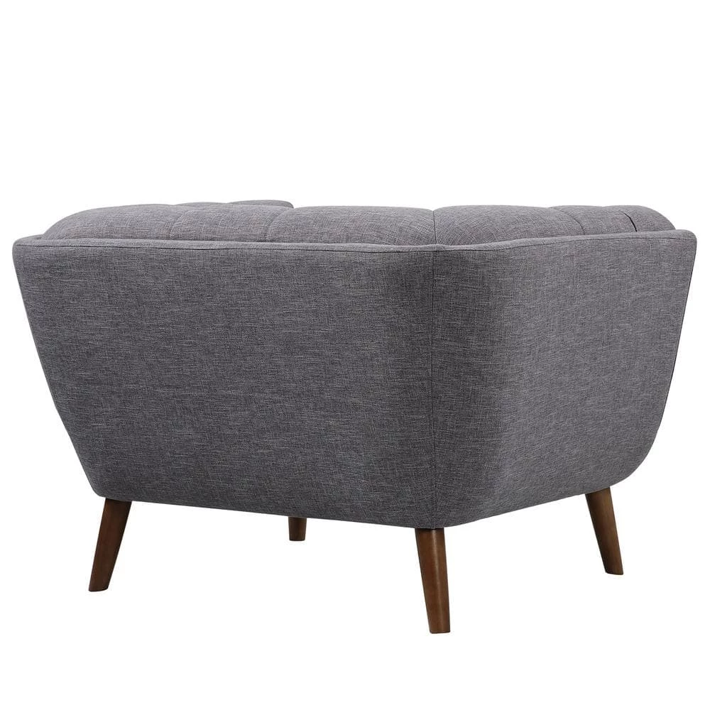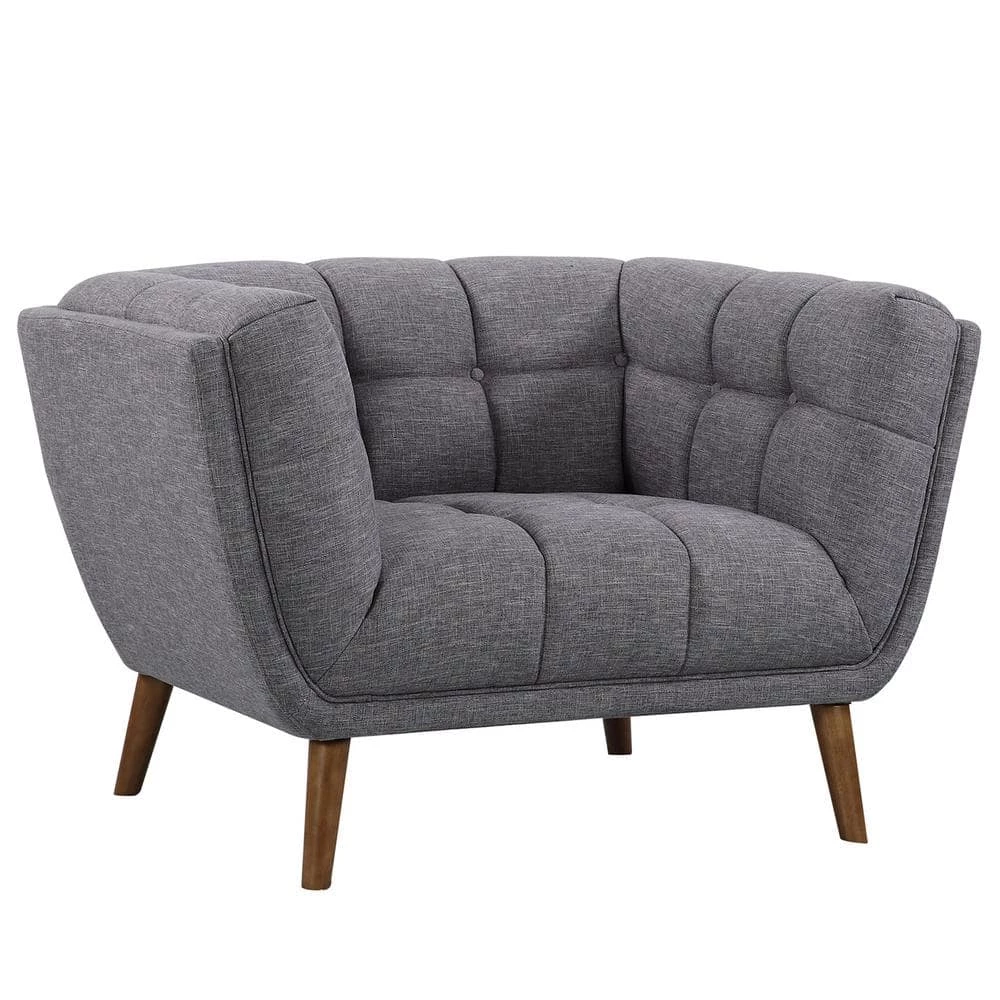 - Dark gray linen fabric upholstery with tufted seat and back