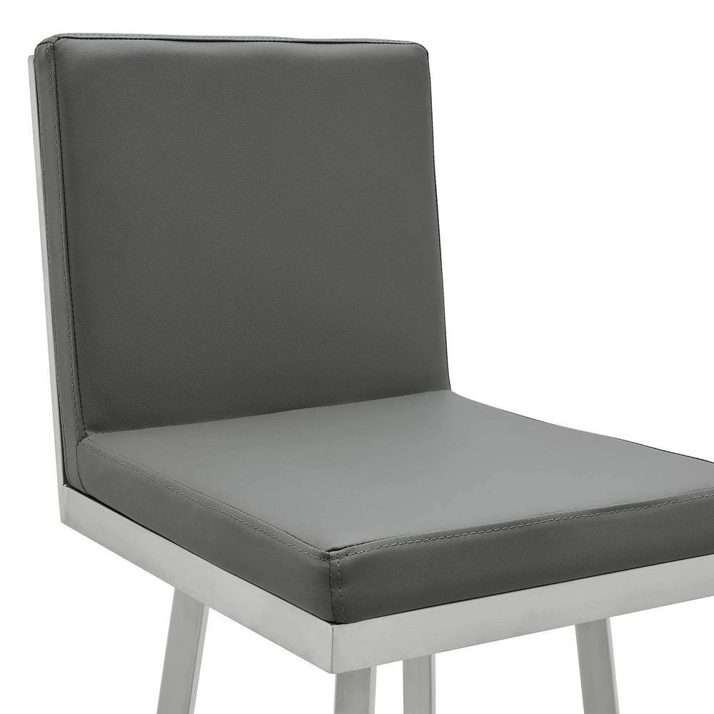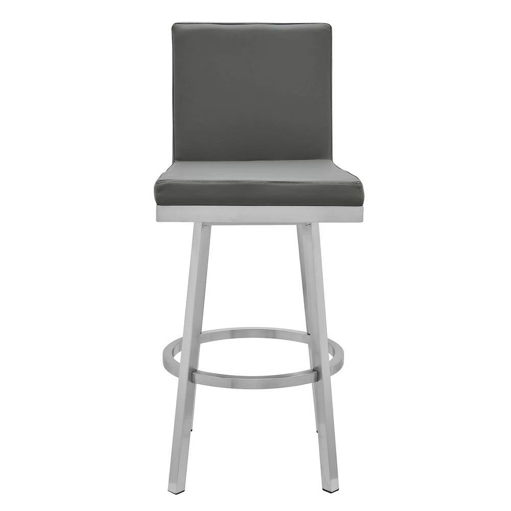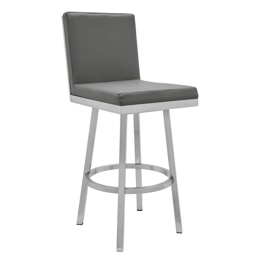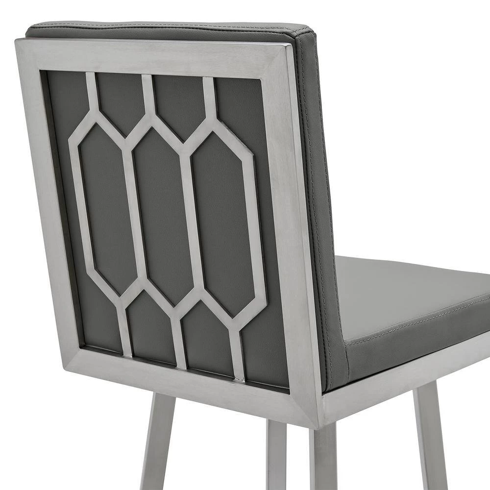 The Rochester Swivel Modern Metal and Faux Leather Bar and Counter stool is the unique furniture addition you need. The intricate geometric metal design on the back makes this a conversation starter at all your gatherings. The cool metal base and seat are complimented by the soft faux leather upholstery that makes cleanup a breeze for any spills or messes. The Rochester bar and counter height stools include a full range swivel functionality that allows you optimal mobility and comfort for hours on end. These stools are a perfect addition to your kitchen island, counter, peninsula, bar, or pub table. Prop your feet up on the convenient square metal footrest and enjoy ultimate comfort after a long day. The Rochester Swivel Modern Metal and Faux Leather Bar and Counter Stool is available in your choice of Bar 30 in. or Counter 26 in. H and comes in your choice of brushed stainless steel or black metal finishes and a beautiful grey faux leather upholstery that can easily blend with any existing decor theme.