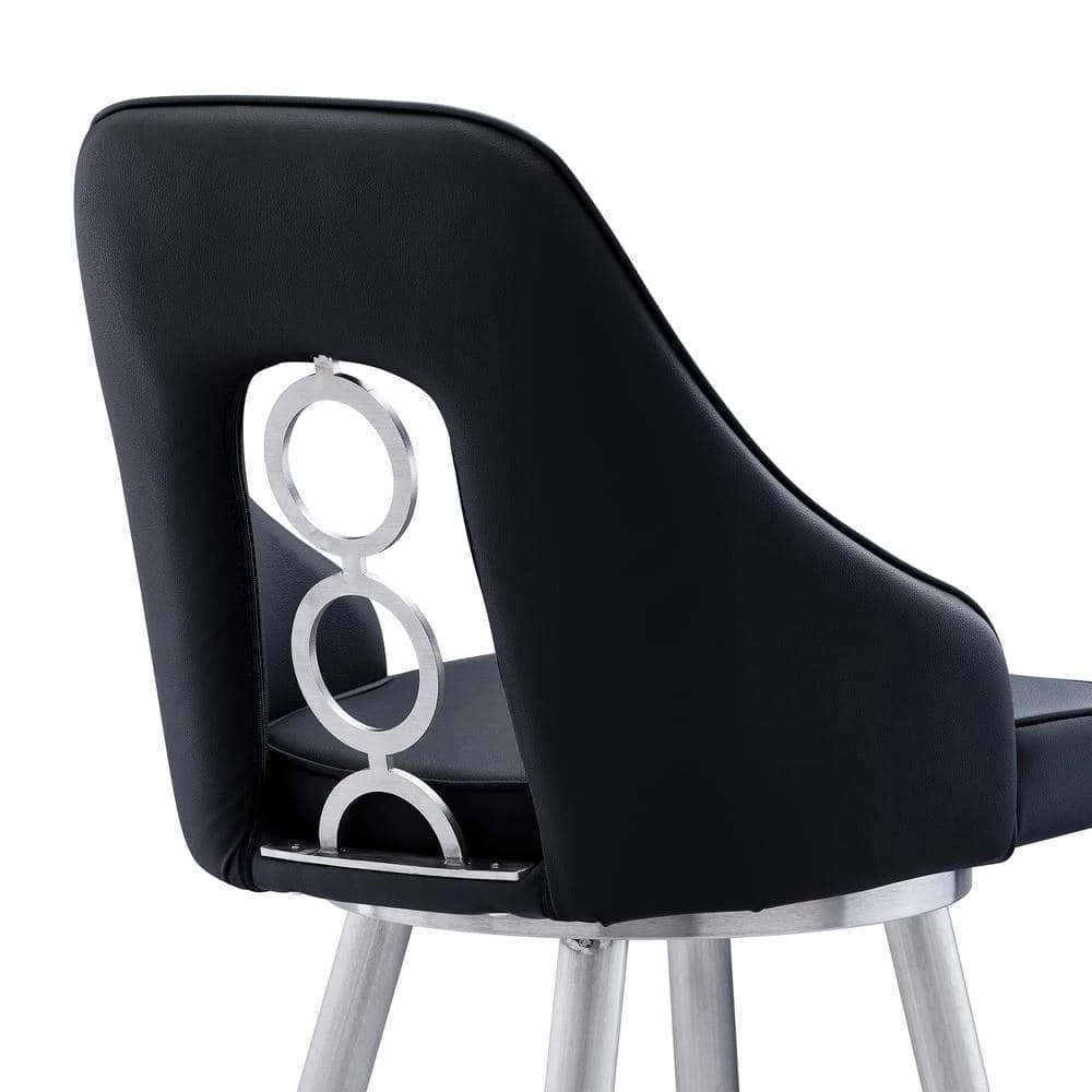 The Armen Living Ruby mid-century Bar Stool features a unique aesthetic that is certain to work well in any modern household. The Rubys durable brushed stainless steel frame is accompanied beautifully by its black faux leather seat and back. The upholstered high back is rounded, providing the user with exceptional support while the 360° swivel seat allows for enhanced mobility. The Rubys contemporary straight leg design endows the Bar Stool with a chic quality that is further accented by the inclusion of a round footrest. The Rubys legs are tipped with floor protectors, assuring that the Bar Stool will not slip on or scratch hardwood or tile floors. The beautiful Ruby is available in 2-industry standard sizes; 26 in. counter and 30 in. bar height.