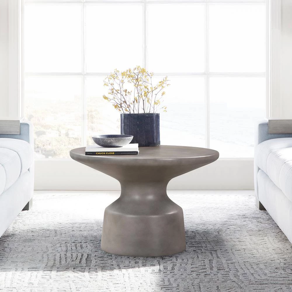Bring an artisanal touch to your home with our Sephie round pedestal coffee table in concrete. Featuring a sculptural silhouette in a smooth and graceful concrete finish, our coffee table serves as a room anchoring piece. The bold and playful design of the table feels fresh in any modern or contemporary setting. The round shape of this coffee table is perfect for homes with small children, and it serves as a safety feature, keeping everyone big and small from sharp edge corners. The coffee table can effortlessly serve as a dramatic base to your favorite centerpiece or decor. With a sleek and artisanal feel, our coffee table is sure to enliven your living room, bedroom, or home office.