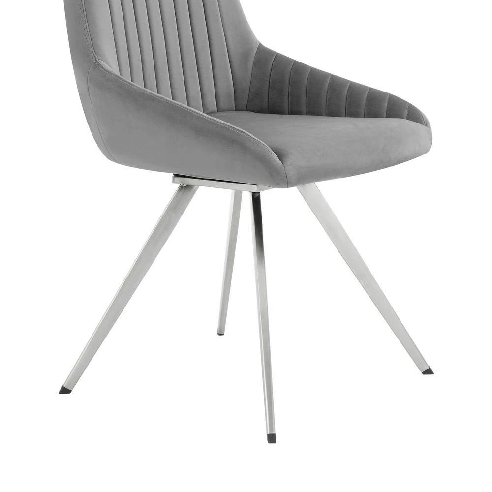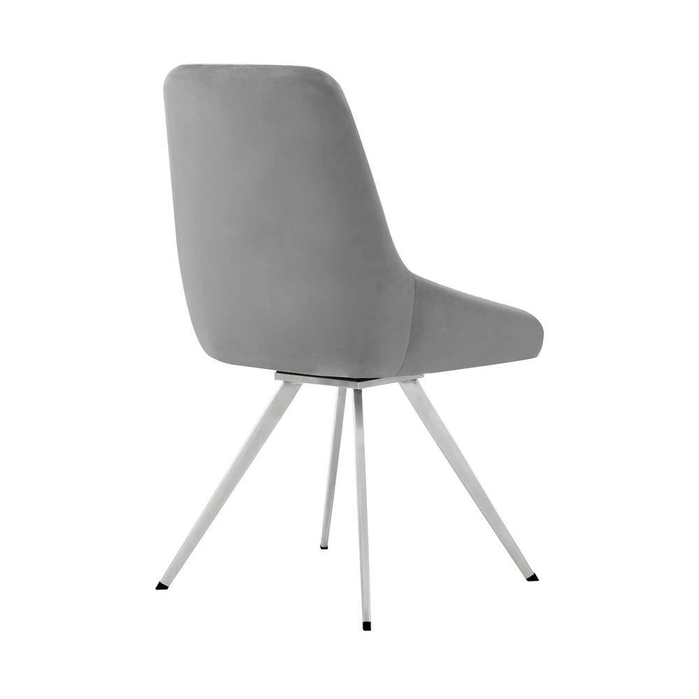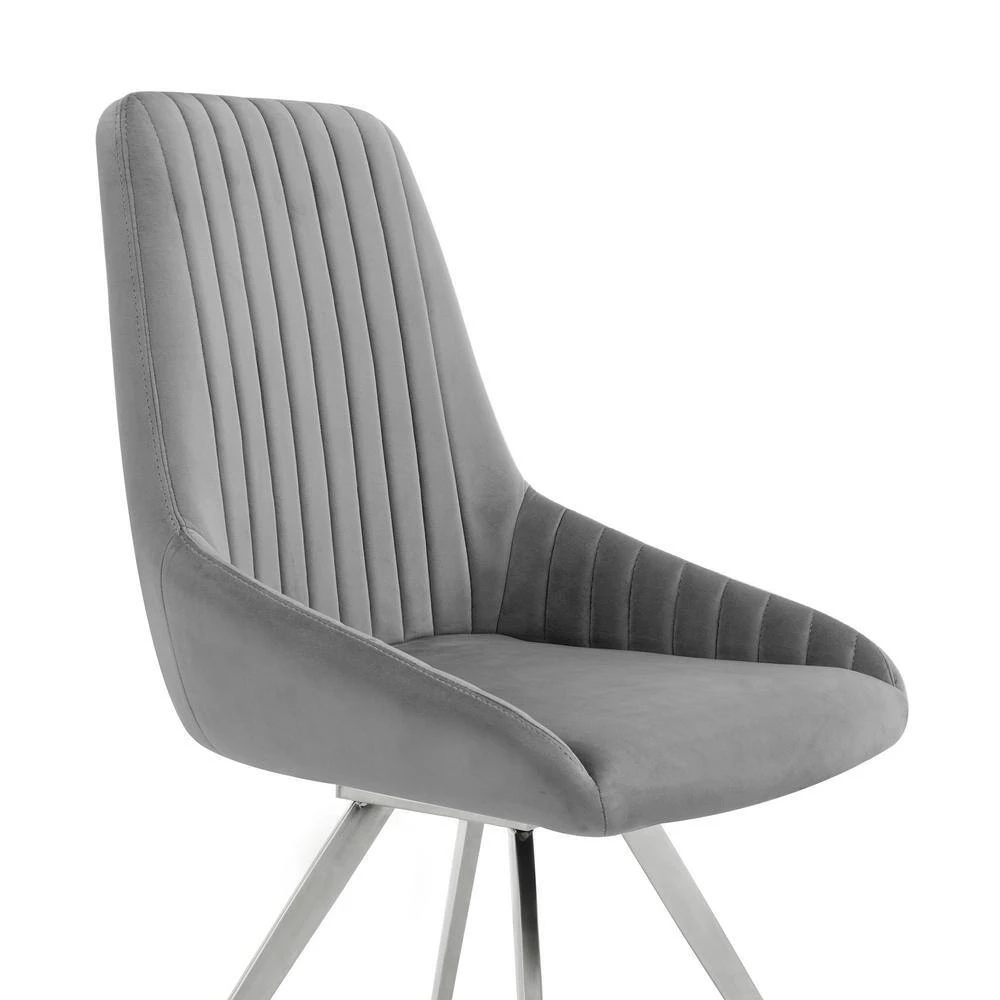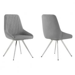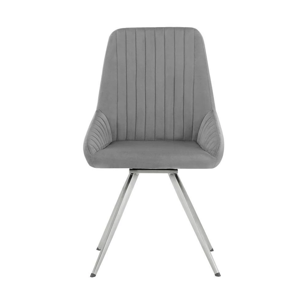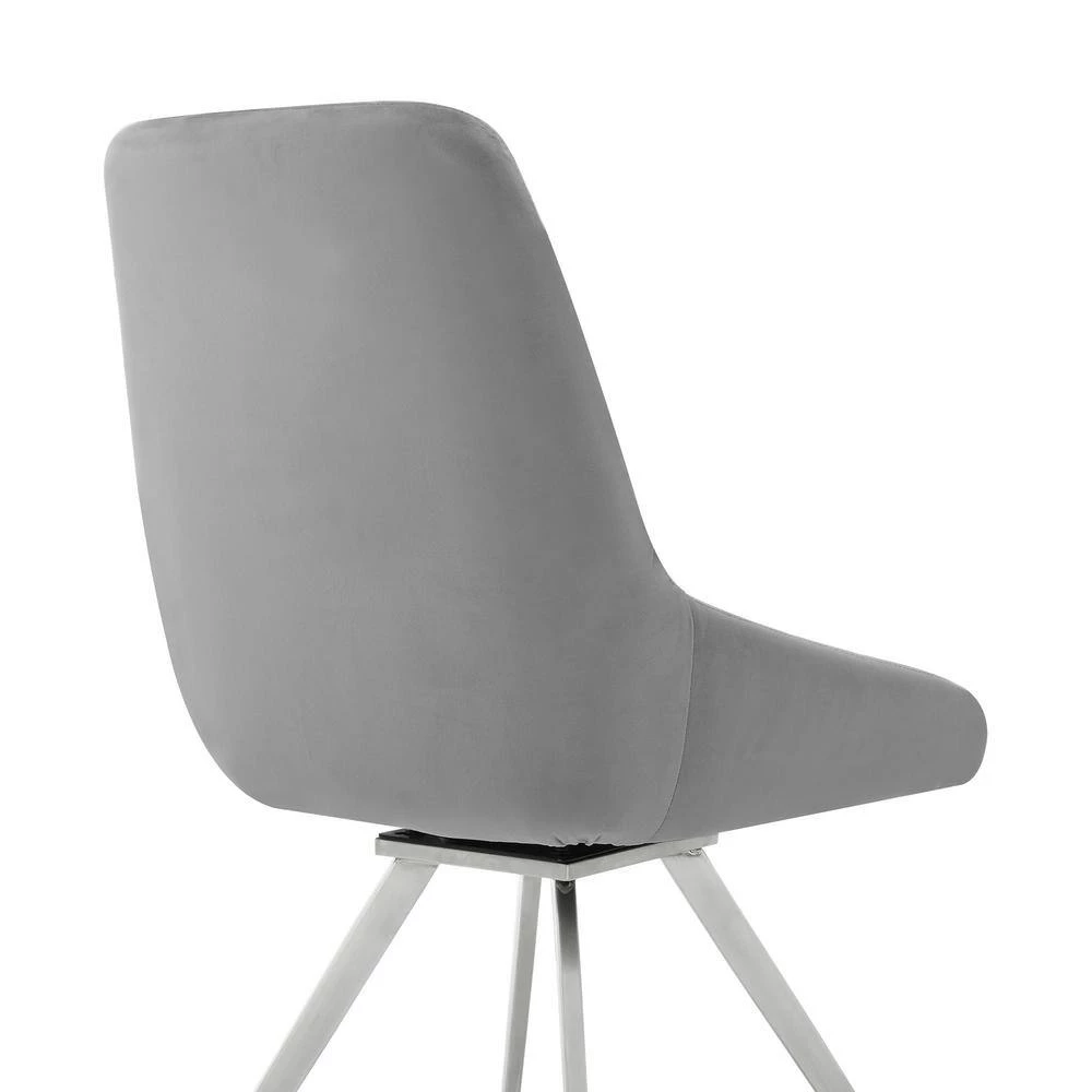 Bring the Skye Grey Velvet Set of Two Dining Chair from Armen Living into your home! The fabric upholstery is luxuriously wrapped around the entire seat. Featuring a wide back and spacious seat, its metal swivel mechanism allows you to turn and glide a full 360°. The clean geometric upholstered lines add a textured look to this chair, covering the ultra-comfortable foam-padded cushion. The refined look of the Alison will update the decor in any dining room, bar or lounge area or wherever you decide to place it! This wonderful chair features a sturdy metal frame that assures dependability and will give you years of enjoyment. Comes in a set of 2 dining chairs.