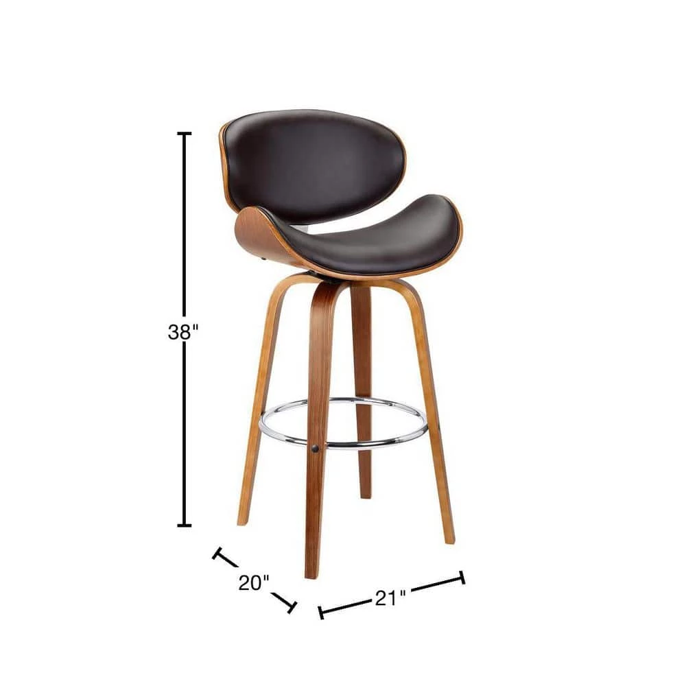 Enhance any kitchen counter seating area with the Armen Living Solvang Bar Stool. This bar stool is made with a faux leather seat, adding a stylish touch. Coming with a wooden frame, it will be an aesthetically appealing, strong piece of furniture for any home. It is designed with a full back for the comfortable feel of a dining chair yet with the look of a stool. Featuring a mid-century modern style, it merges minimalism with practicality. This stool has a swivel mechanism, so you can move it around to talk to people sitting next to you. It features a foot rest, promoting good sitting posture with its ergonomic design. Designed in brown, it will match with your other furniture.