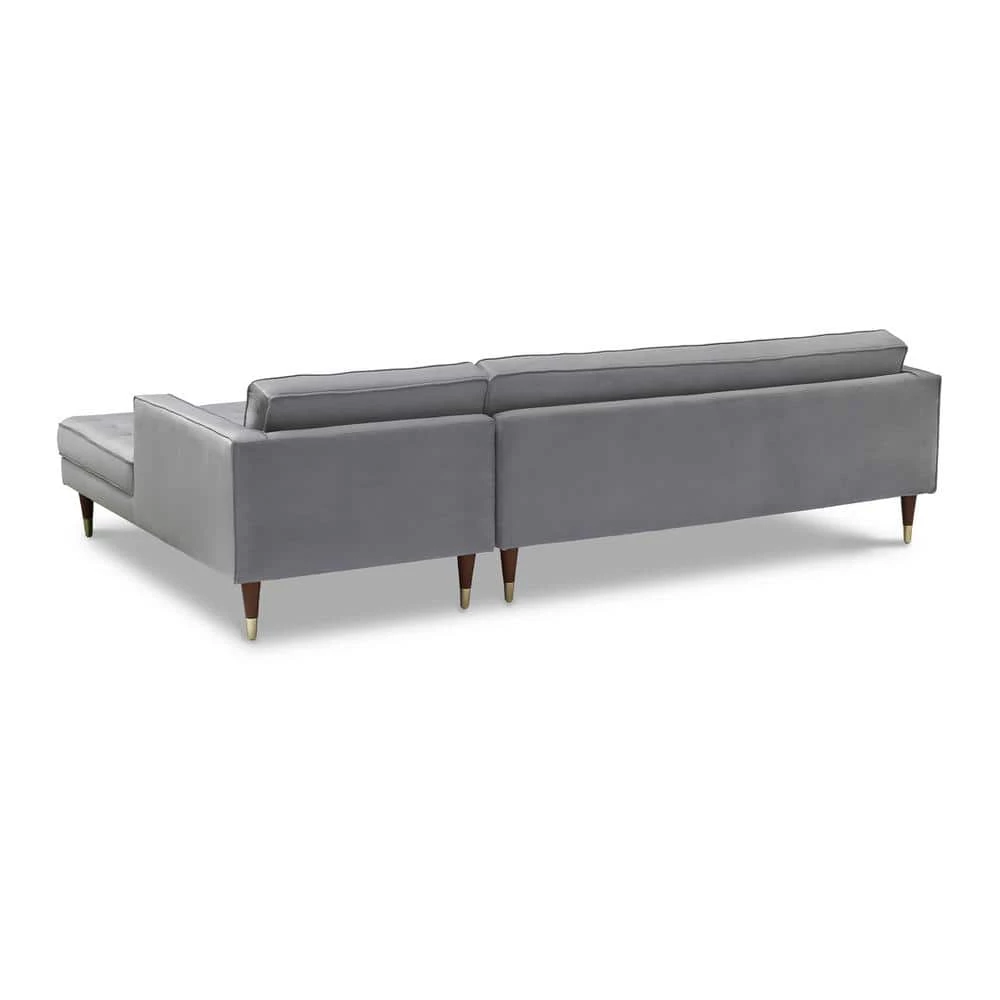 The Armen Living Somerset Velvet Mid Century Modern Right Sectional Sofa adds a touch of luxury to any home. Designed for elegant, comfortable living, this contemporary tufted sectional is a classic. Its generous proportions are upholstered in sumptuous velvet with luxurious tufted detail. The gold-finished caps on its tapered wooden legs add fun retro flair. The Armen Living Somerset Velvet Mid Century Modern Collection features a club chair, loveseat and sofa. This Velvet sofa is available in your choice of Taupe or Grey velvet upholstery.