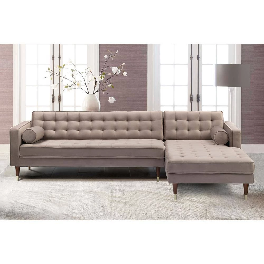The Armen Living Somerset Velvet Mid Century Modern Right Sectional Sofa adds a touch of luxury to any home. Designed for elegant, comfortable living, this contemporary tufted sectional is a classic. Its generous proportions are upholstered in sumptuous velvet with luxurious tufted detail. The gold-finished caps on its tapered wooden legs add fun retro flair. The Armen Living Somerset Velvet Mid Century Modern Collection features a club chair, loveseat and sofa. This Velvet sofa is available in your choice of Taupe or Grey velvet upholstery.
