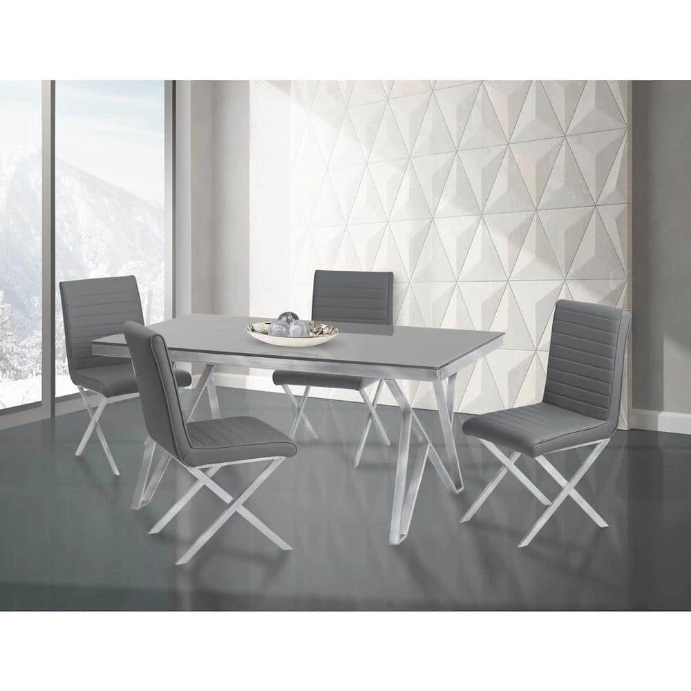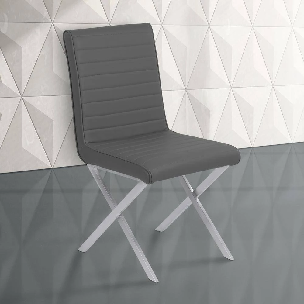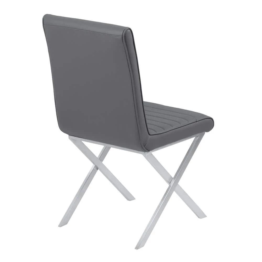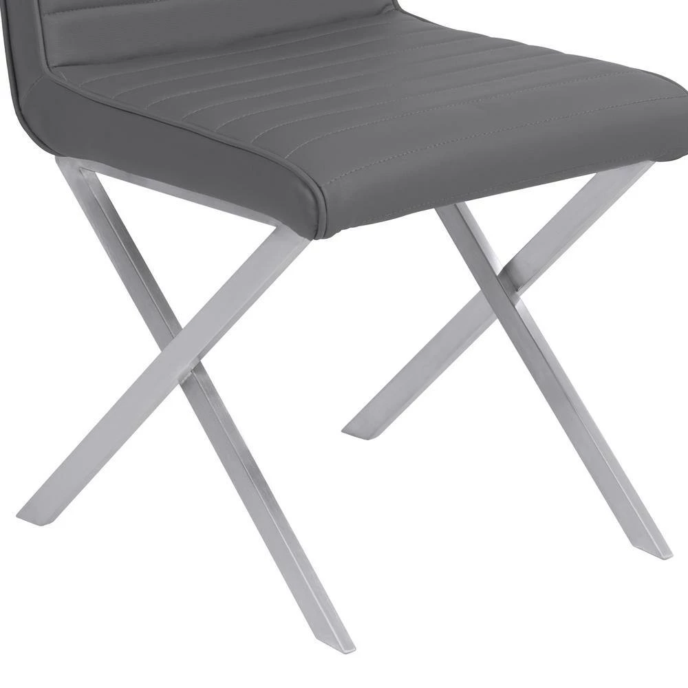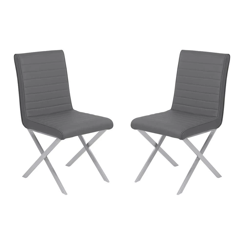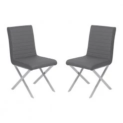The Armen Living Tempe contemporary dining chair is both stylish and practical, a perfect addition for any modern home. The durable brushed stainless steel cross-legs are expertly designed to be both aesthetically pleasing and complimentary to the plush faux leather upholstered seat. The design of this piece allows it not only to function in the dining room, but in every other room in the house as well. The Tempe is sold in a set of two and is available in three stylish colors; grey, black, and white.