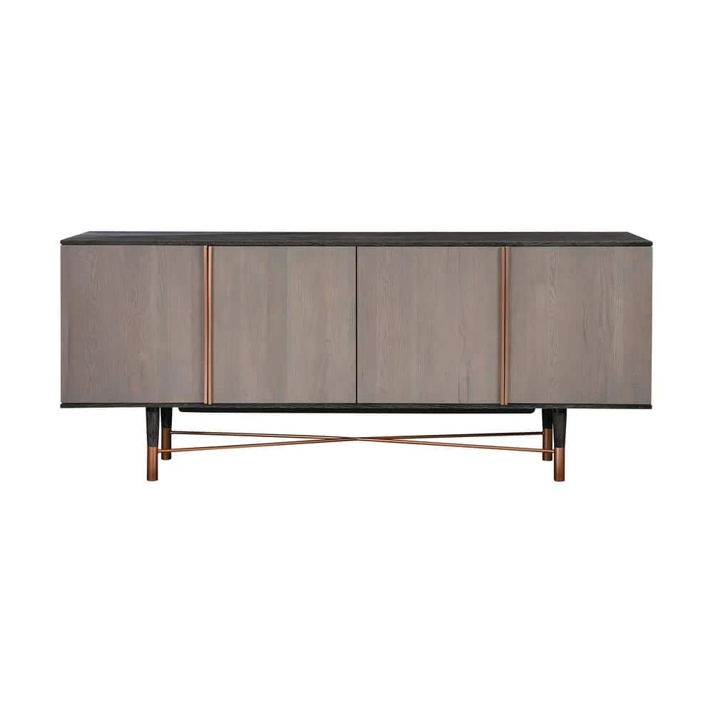 Offer up a touch of sleek and modern look to your dining or bar area with this Armen Living Turin Solid Oak Sideboard, it is a perfect piece for your traditional and welcoming space. The dark shiny wood finish feels smooth to the touch, it is an exceptional piece that provides convenient storage space in an attractive design. The base feature x-shape metal copper frame with four straight tipped legs for sturdiness and durability. This spacious Sideboard feature 4 cabinets with soft close function. This Sideboard will make a simple storage solution to any well-appointed space in your home. Perfect as a sideboard, credenza, buffet cabinet or display stand and can also accommodates flat-screen TVs up to 60″ wide as a living room or lounge area TV stand. This item is a part of the Armen Living Turin collection but can be mixed and match in any contemporary or modern style home.
