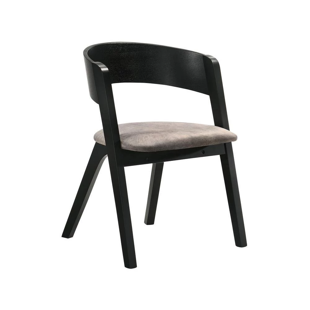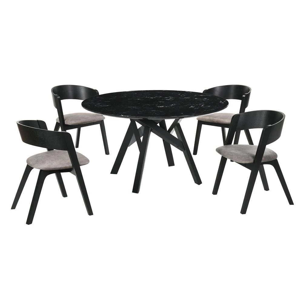 The Armen Living Venus 5 piece dining set are both simple but elegant that will complete any contemporary style home. The table has sleek muted black wood finish with 4 pointed leg base, compliment with a beautiful marble top. The Venus table comes with 4 Jackie black chairs that feature upholstery seats and back for optimum comfort. The beauty of this pairing lies in the subtle interplay of soft and neutral colors with a modern design structure. This piece is practical, yet highly appealing, making it the ideal combination for any contemporary dining room.