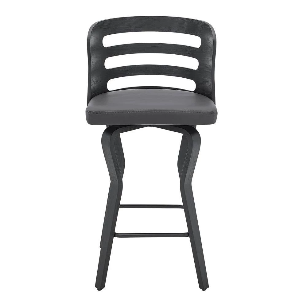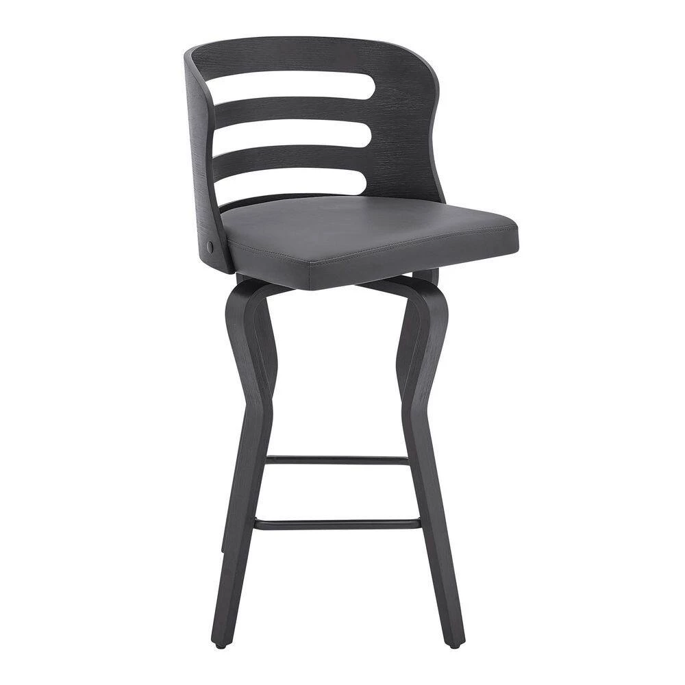 Gather your family and friends and seat them in the Verne 26 in. Grey Faux Leather and Matte Black Wood Swivel Barstool from Armen Living. This wonderful bar stool is crafted to be breathable, with its slotted back, as well as functional, with the 360° swivel function for full mobility. The faux-leather upholstery is soft, yet durable covering the soft foam-padded seat, giving you the look, feel, and longevity you have always been looking for. The wood chair back and legs are crafted to be durable sturdy, doing all the work for you by maintaining themselves for many years to come. The Verne also features an additional footrest for extra comfortability. Also available in 26 in. counter h8-and 30 in. bar height.