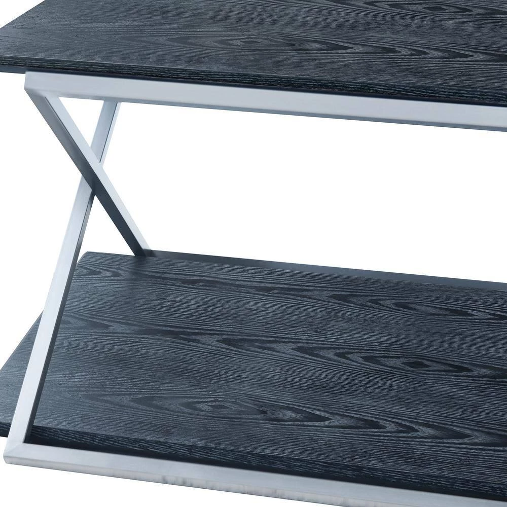 The Westlake Black Wood and Brushed Steel Coffee Table from Armen Living is what your living room needs to take your home decor to the next level. The Westlake table features dual resting shelves that maximize your storage space – giving you ample surface area to place your favorite personal items or decorative centerpieces. The wood of the coffee table is waterproof and wear-resistant, fighting off everyday wear and tear and giving you years of enjoyment. The craftsmanship shown through the design of the table is very apparent – the rich silver accents, the unique x-shape frame, and the gorgeous wood all contribute to this special piece.